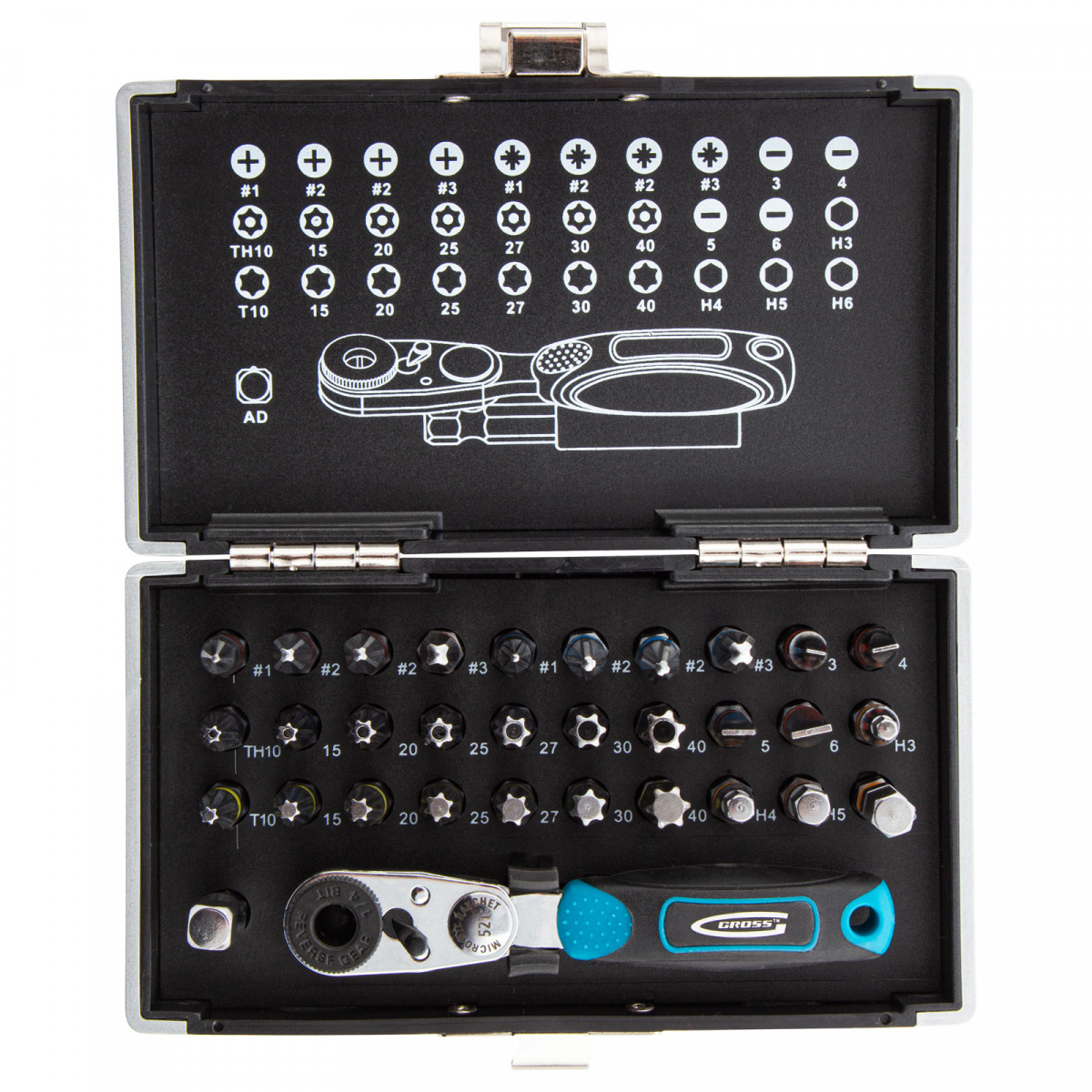Набор бит с магнитным держателем Gross 11365 с присоединительным размером 1/4 дюйма, 33 предмета из стали S2 в пластиковом кейсе, предназначен для сборки мебели, велосипедов, бытовых приборов, для технического обслуживания автомобилей и прочих монтажных, строительных и слесарных работ. В комплекте подобраны 30 бит самых ходовых типоразмеров, компактный ключ-трещотка с 52 зубьями, магнитный адаптер для бит, а также переходник для использования торцевых головок.