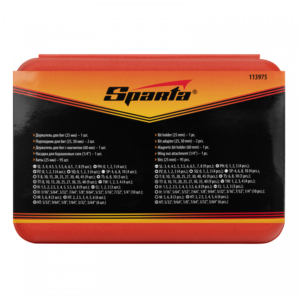 Набор бит Sparta 113975 в пластиковом боксе состоит из 100 предметов: 95 насадок из стали CrV для шуруповертов и отверток, а также битодержателя, адаптеров для торцевых головок, переходника и шестигранного ключа. В наборе широкий ассортимент типоразмеров бит: SL, PH, PZ, GR, SP, TR, TT, TW, R, C, HEX, SPAN — для монтажа и демонтажа шурупов, евровинтов, барашковых гаек, кровельных саморезов, рым-гаек и других резьбовых крепежей. Комплект будет полезен домашним и профессиональным мастерам для проведения ремонта, сборки мебели и оборудования, выполнения других работ.
