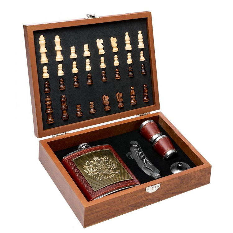 Подарочный набор в деревянном чемодане. Чемодан сделан из лакированного дерева, внутри бархатная подложка. Чемодан закрывается на защелки, имеет удобную ручку. В крышке расположен набор для игры в шахматы. На крышке изображена шахматная доска. Фляжка и стопки выполнены из нержавеющей стали, декорированы искусственной кожей. Фляжка украшена металлической пластиной "Герб России"