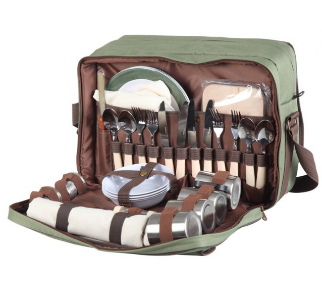 Набор для пикника на 4 персоны включает 4 глубокие тарелки, 4 мелкие тарелки, 4 металлические кружки, 4 стопки, 4 ложки, 4 вилки, 4 ножа, 1 нож разделочный, 1 солонка, 1 штопор-открывашка, 1 скатерть, 4 салфетки, 1 доска разделочная.