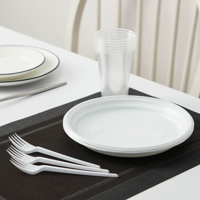 Комплектация: -стаканы 200 мл -вилки -тарелки.