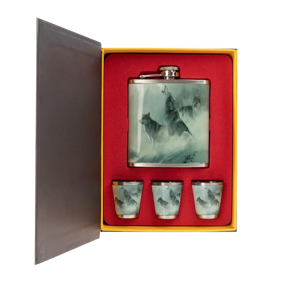 Подарочный набор "Книга охотника Волки" – это набор 4 в 1 в красочной коробке, открывающейся сверху, как книга: • 1 фляжка 210 мл; • 3 стопки. Фляжка и стопки изготовлены из нержавеющей стали. Сверху на них нанесена красочная картинка. Обложка картонной упаковки в виде книги фиксируется расположенными в ней магнитами.