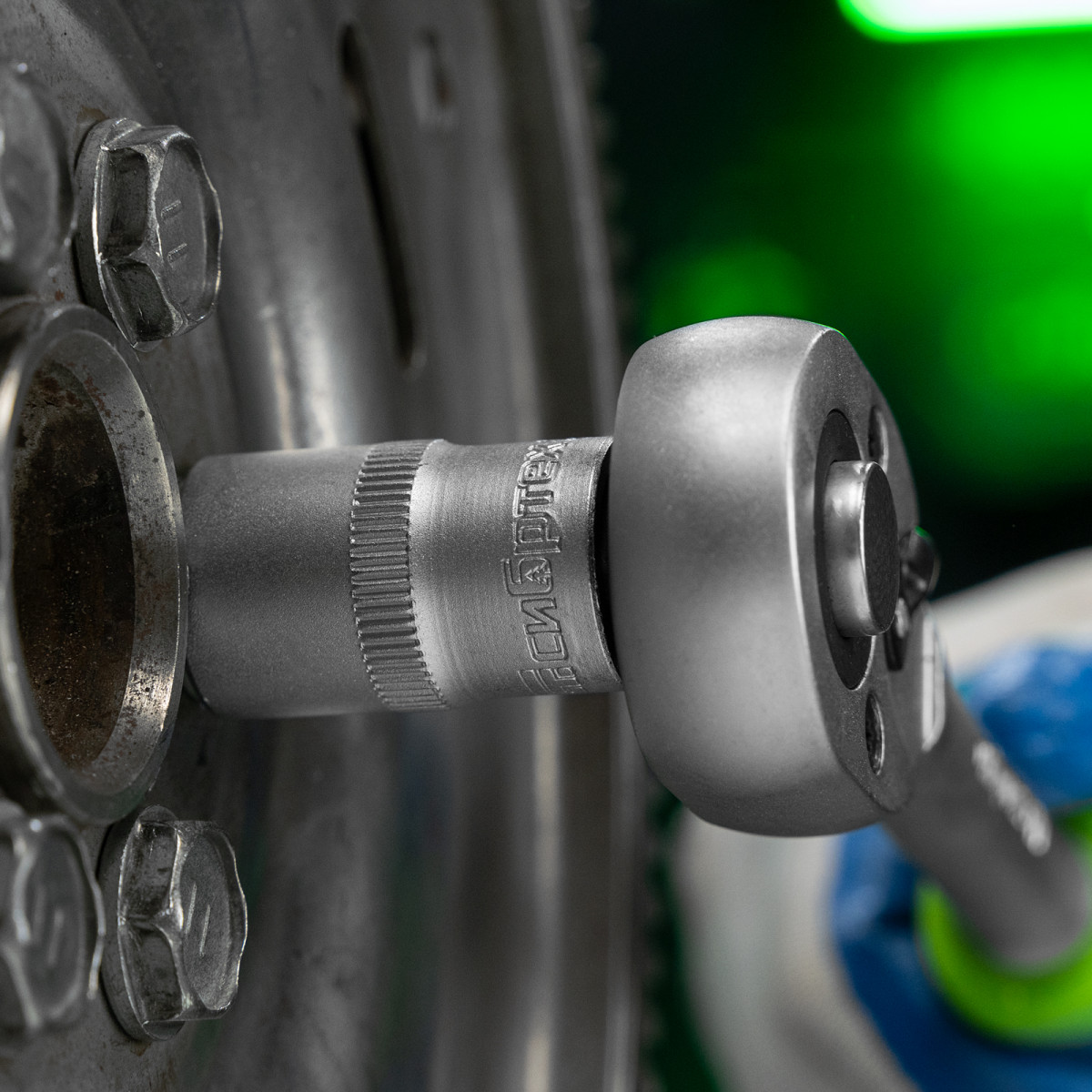 • Прочная фиксация — шариковый замок на трещотках, воротках, шарнирах и удлинителях надежно удерживает головки.