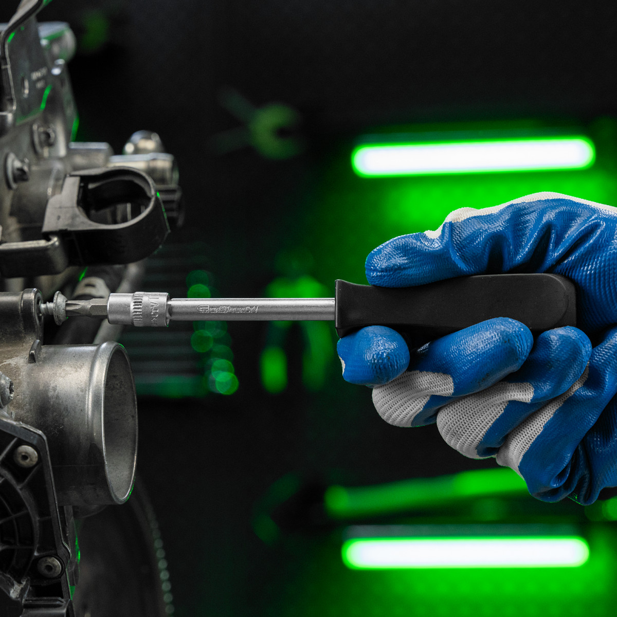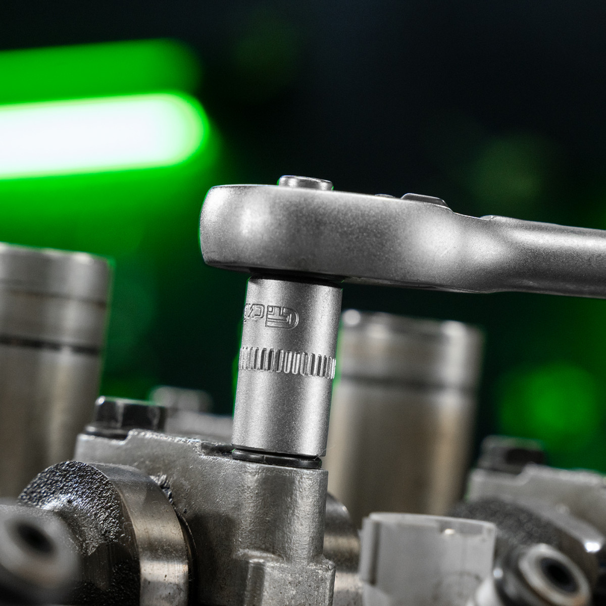 • Комфортная и эффективная работа — ключи-трещотки с 45 зубьями оснащены механизмом быстрого сброса, переключателем реверса с металлическим флажком и двухкомпонентной рукояткой.