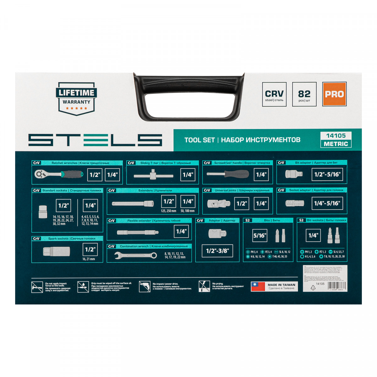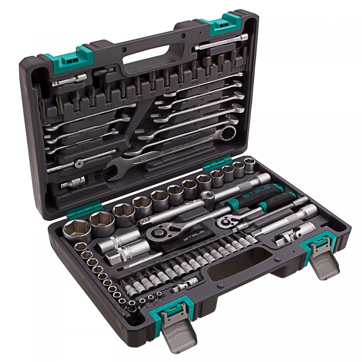 Набор инструментов Stels 14105 в ударопрочным пластиковом кейсе состоит из 82 предметов с присоединительными квадратами 1/2″ и 1/4″, из стали CrV и S2, и предназначен для выполнения слесарно-монтажных работ. Включает инструменты и насадки для работы с резьбовыми крепежами, а также удлинители (в том числе гибкий) и т-образные воротки, облегчающие работу в труднодоступных местах. Набор предназначен для профессионального использования в автомастерской, будет полезен и для решения бытовых задач.