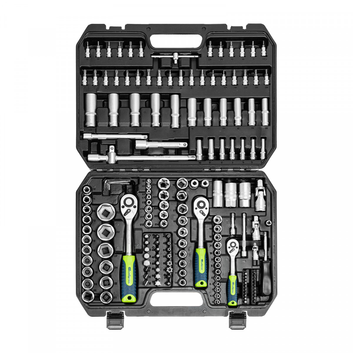 Набор инструментов Сибртех 14171 упакован в пластиковый кейс и состоит из 172 предметов с присоединительным размером 1/2", 3/8", 1/4", предназначенных для монтажа и демонтажа резьбового крепежа с разными типами шлицев. В комплект поставки входят карданы, удлинители и переходники, облегчающие работу в труднодоступных местах. Набор используется для ремонта автомобилей, а также будет полезен в быту.