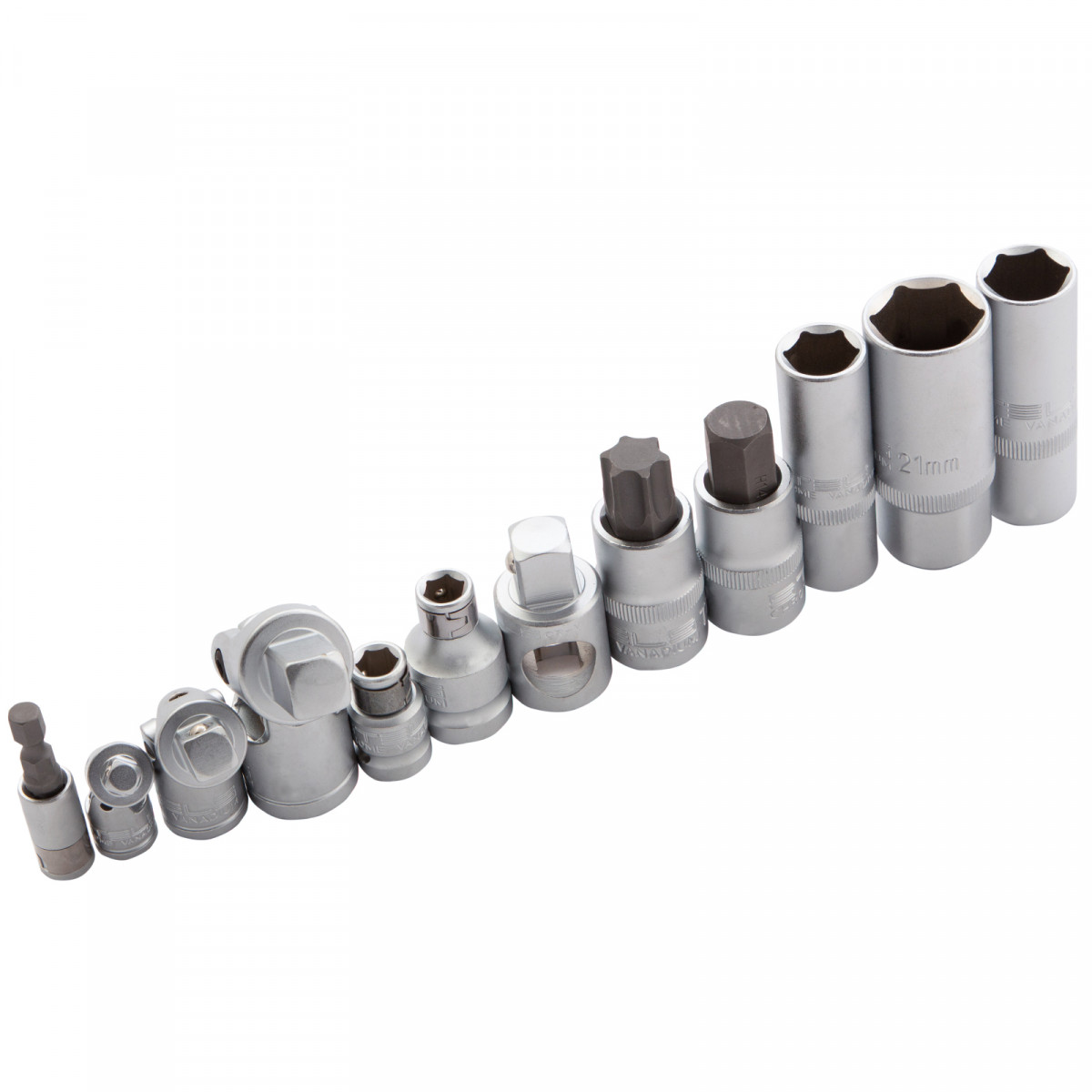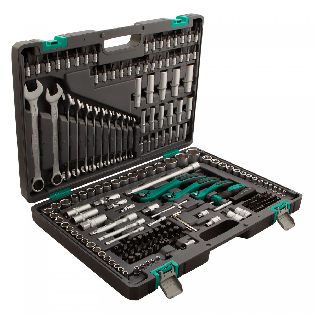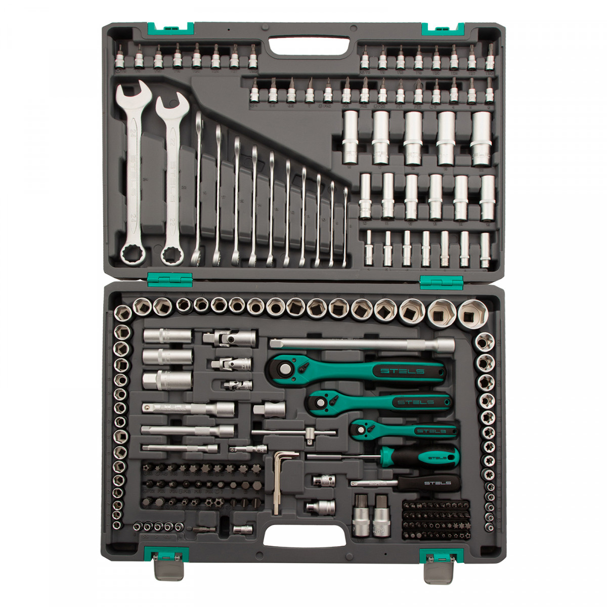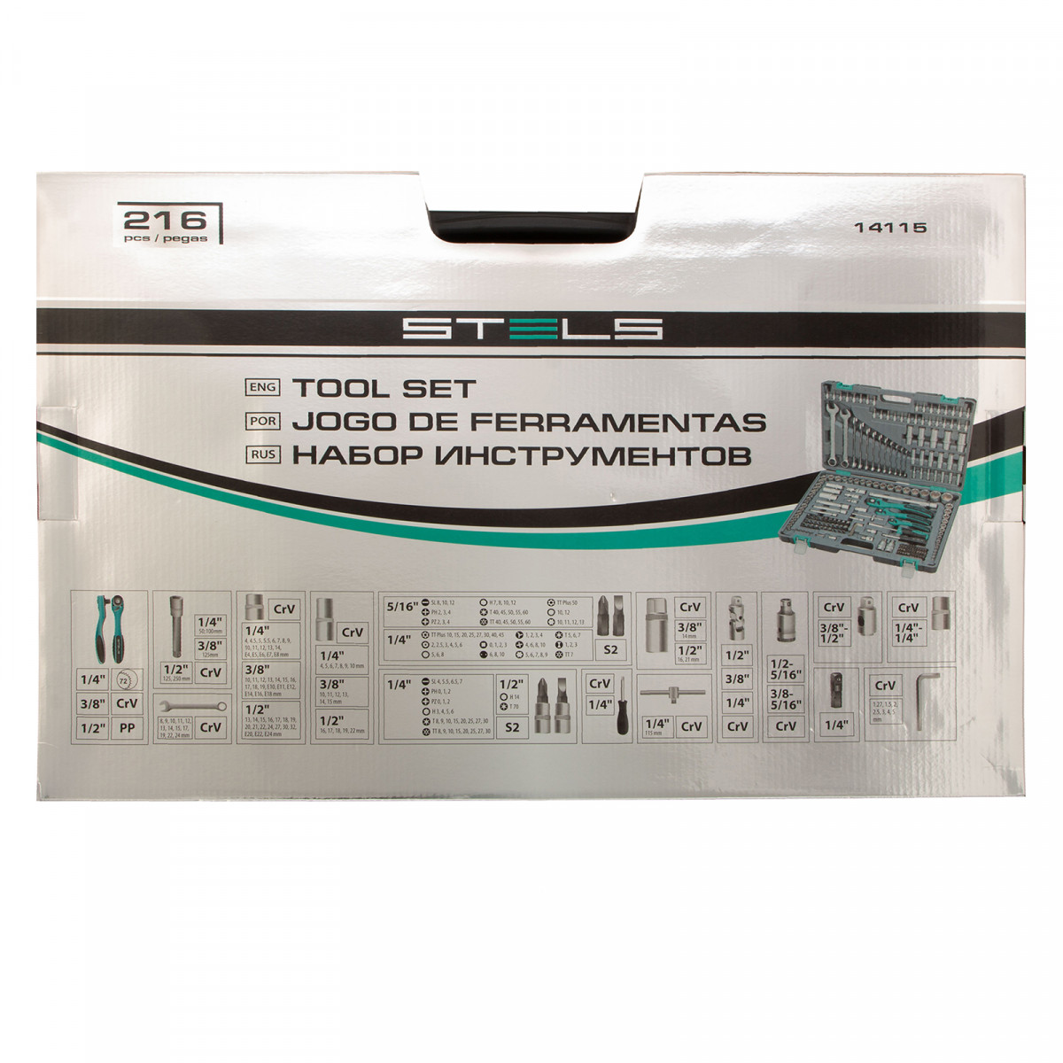 Набор инструментов Stels 14115 в ударопрочным пластиковом кейсе состоит из 216 предметов с присоединительными квадратами 1/4″, 3/8″ и 1/2″, из стали CrV и S2, и предназначен для выполнения слесарно-монтажных работ. Включает инструменты и насадки для работы с резьбовыми крепежами, а также удлинители (в том числе гибкий), т-образный вороток и карданные шарниры, облегчающие работу в труднодоступных местах. Набор предназначен для профессионального использования в автомастерской, будет полезен и для решения бытовых задач.