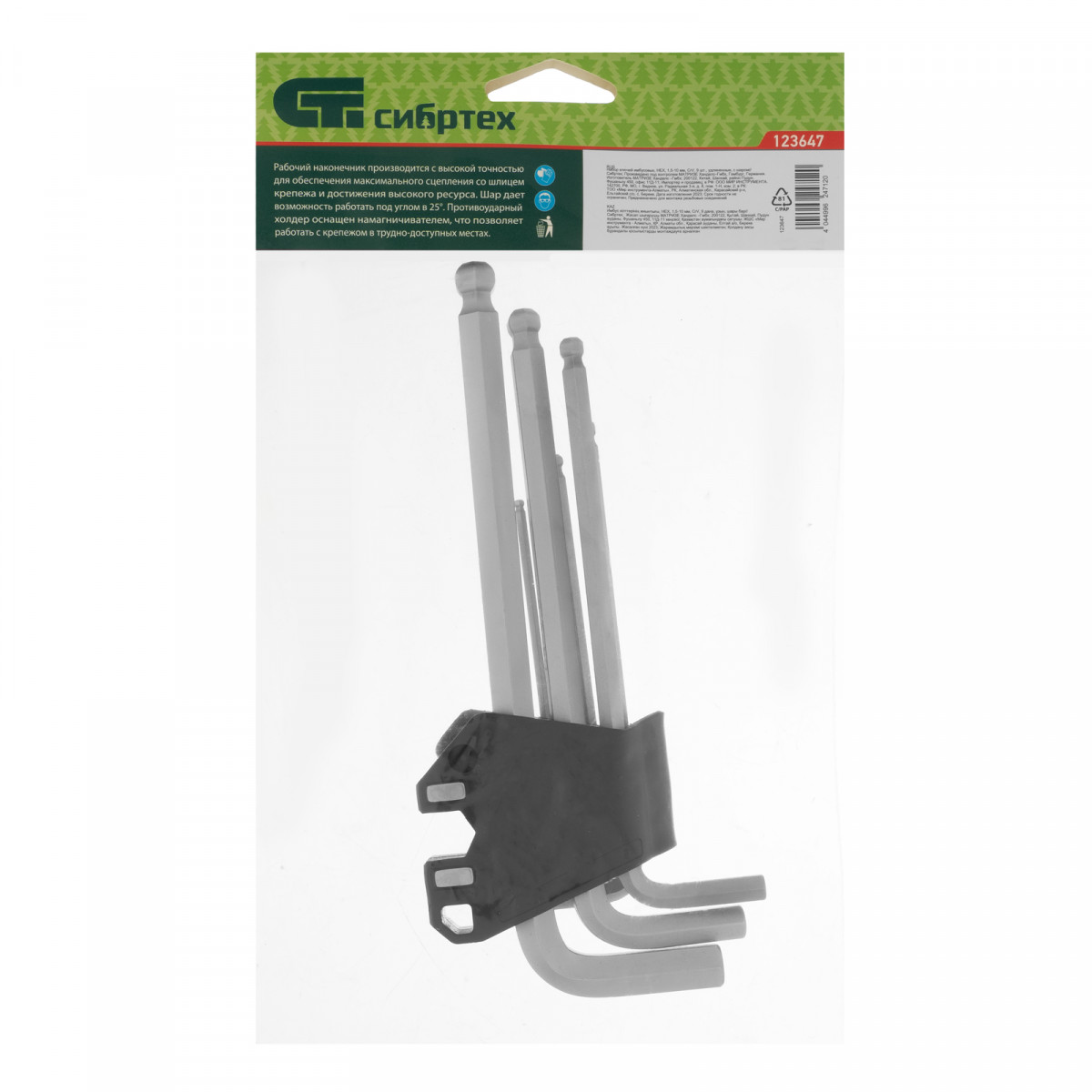 Набор ключей имбусовых, HEX, 1,5-10 мм, CrV, 9 шт., удлиненные, с шаром Сибртех