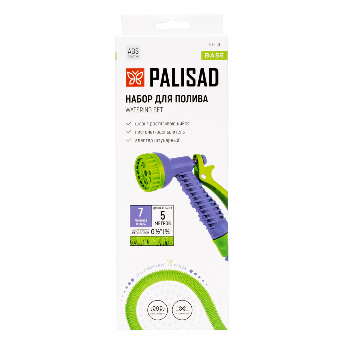 Поливочный набор Palisad 67690 включает в себя усиленный шланг, растягивающийся до 15 м, 7-режимный пистолет и штуцерный адаптер. Предназначен для полива растительности на дачном участке, в парке или сквере. Представляет собой полностью готовую к работе систему. Соединитель с переходником позволяет подключать шланг к крану или отводу с резьбовым выходом диаметром 1/2" или 3/4".