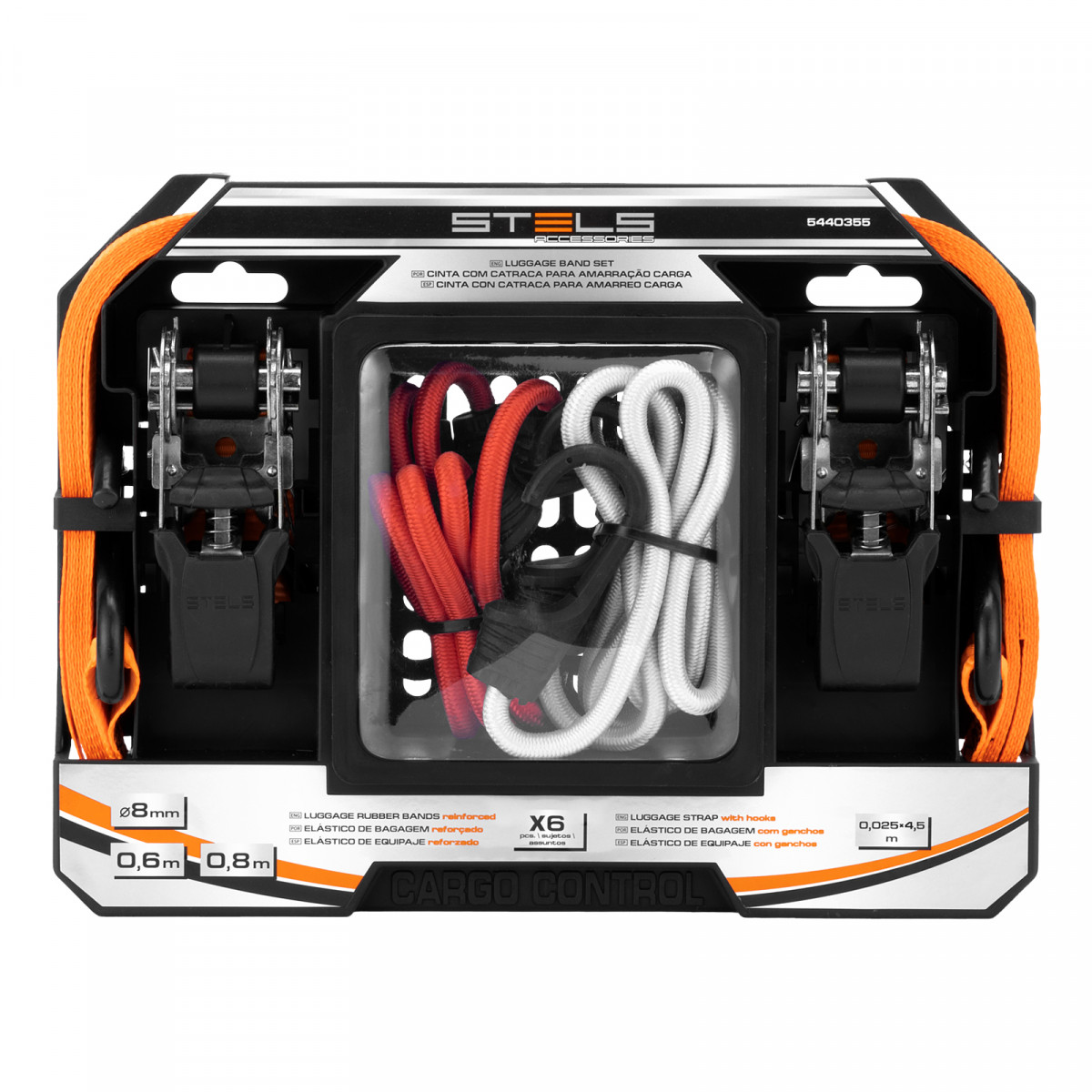 Набор стяжек и резинок Stels 54403 используется для фиксации грузов и будет полезен в автопутешествии. В комплекте ремни с храповыми механизмами, а также резинки разной длины с крюками. Разрывная нагрузка ремней составляет 680 кг, а эластичных стяжек — 50 кг, поэтому они надежно фиксируют предметы различных габаритов, предотвращая их смещение во время перевозки.