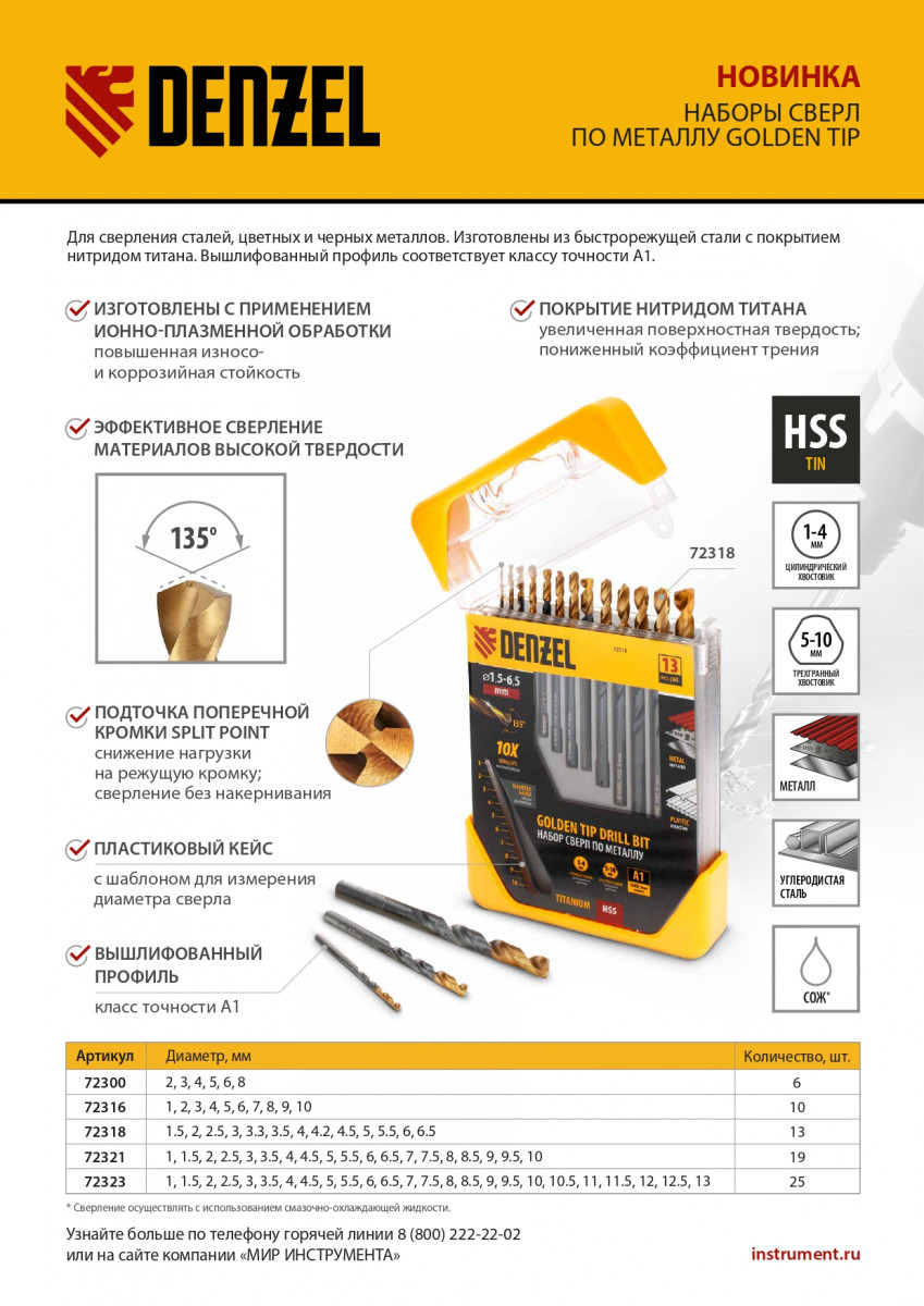 Набор Denzel Golden Tip 72323 включает 25 сверл по металлу для получения отверстий диаметром 1-13 мм в стальных заготовках. Широкий размерный ряд позволяет эффективно решать задачи любой сложности. Вышлифованные на высокоточном оборудовании оснастки имеют класс точности A1, что существенно повышает качество выполняемых работ. Набор упакован в пластиковый кейс. Удобный шаблон в крышке кейса позволяет быстро определить диаметр сверла, что экономит время на подбор оснастки.