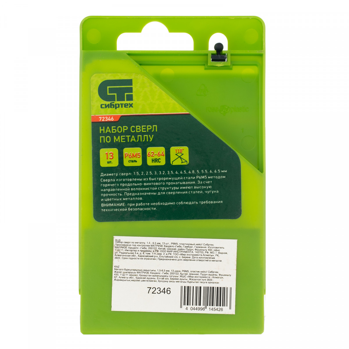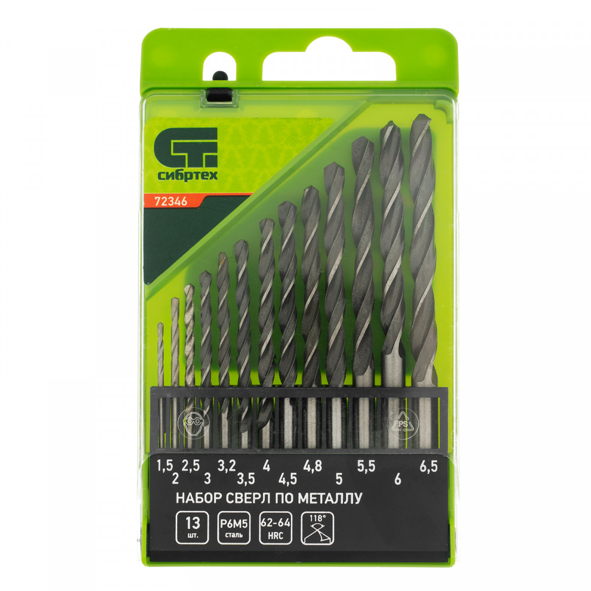 Набор сверл по металлу, 1.5-6.5 мм, 13 шт, Р6М5, пластиковый кейс, Сибртех