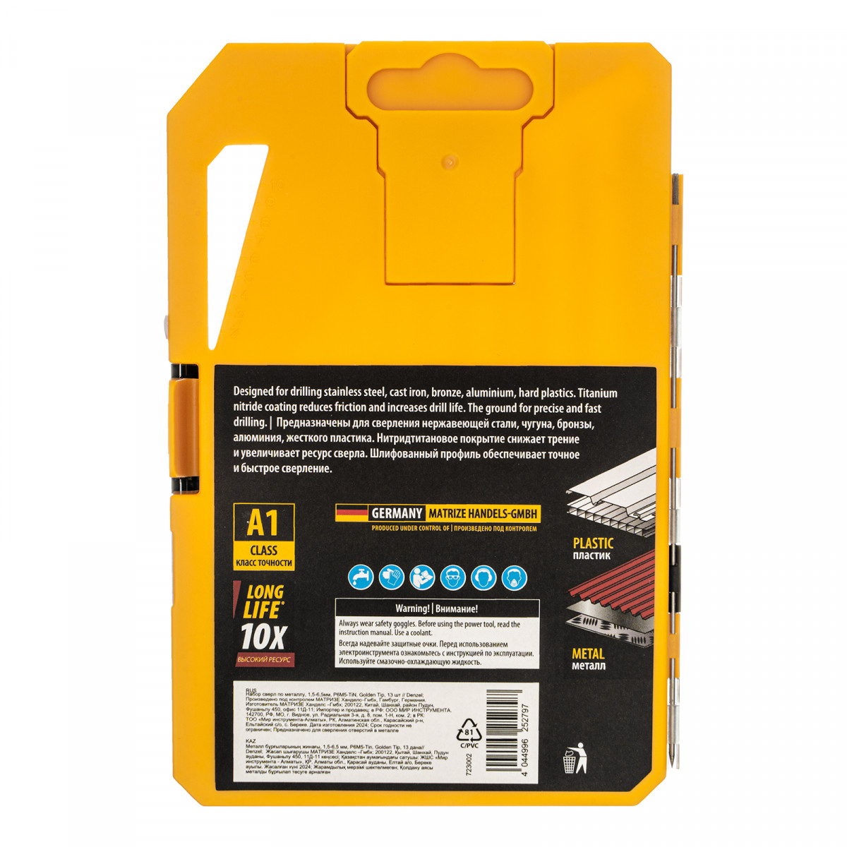 Набор сверл по металлу, 1,5-6,5мм, Р6М5-TiN, Golden Tip, 13 шт Denzel