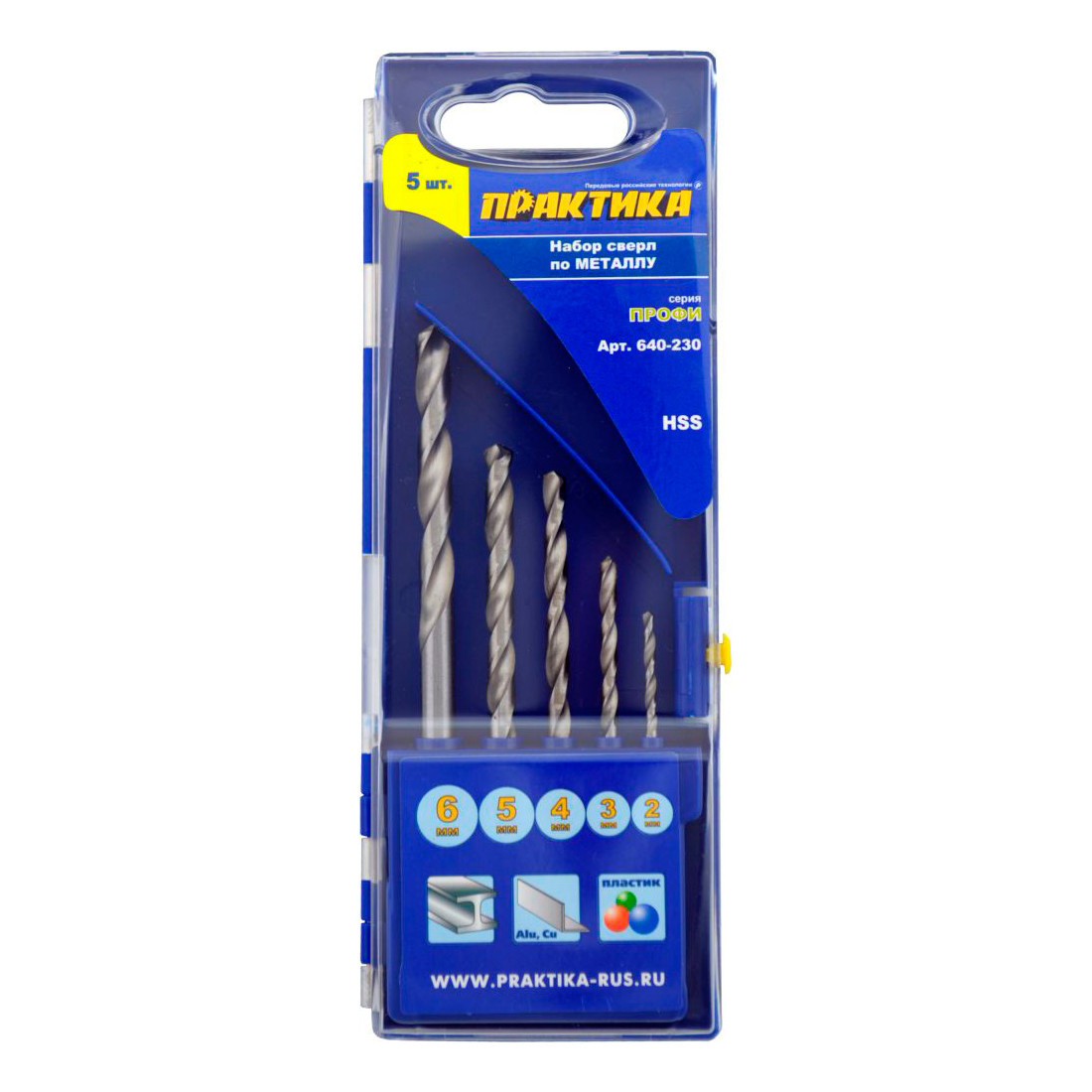 Набор сверл ПРАКТИКА 640-230 металл, 5шт.: 2,3,4,5,6мм, ПРО кассета, ''Профи''Набор сверл по металлу серия Профи 5 штук. Сверла по металлу из быстрорежущей стали Р6М5. Угол заточки 118о. Полностью шлифованное. Для сверления стали прочностью на растяжение до 900Н/мм2, подходит для сверления цветных металлов, дерева.