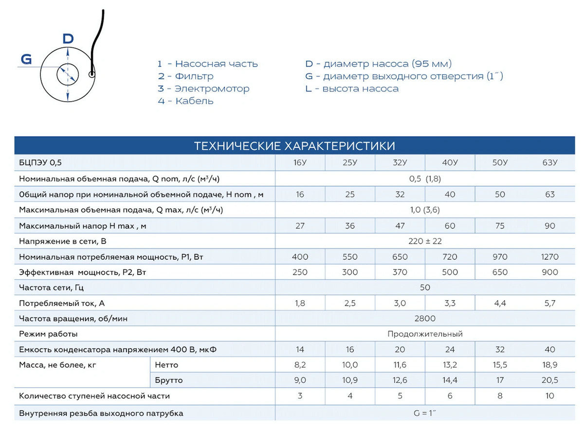 Бытовой Центробежный Погружной Электронасос для колодцев и скважин диаметром от 110 мм, с номинальным напором 25 метров, предназначен для перекачивания чистой воды в бытовых условиях. Номинальный расход: 1,8 м³/чНоминальный напор: 25 м. Потребляемая мощность: 500 ВтПроизводство: «Промэлектро», г.Харьков, Украина Насос Водолей БЦПЭ может быть использован для подачи воды из любого источника (колодец, скважина, емкость, река). Он очень компактный и легкий, поэтому без особого труда может использоваться в переносном варианте. При использовании в ручном режиме насос достаточно просто включить в розетку.Асинхронный, маслозаполненный электродвигатель через промежуточную муфту приводит в движение вал насосной части, на котором жестко закреплены рабочие колеса, перекачивающие воду. Принцип действия насоса — центробежный. Забор воды происходит между двигателем и насосной частью, через отверстия во всасывающей решетке.Насос снабжен электрокабелем и конденсаторным блоком. Кабель выведен из двигателя и проходит вдоль насосной части сбоку, под защитной планкой. Верхняя крышка насоса с резьбовым патрубком (без встроенного обратного клапана), и двумя проушинами для крепления страховочного троса.В обмотке двигателя встроено надежное тепловое реле, которое защищает насос по току (перегрузке). Автоматический перезапуск при срабатывании реле. Защиты от сухого хода в насосе нет, установка внешней защиты по необходимости.