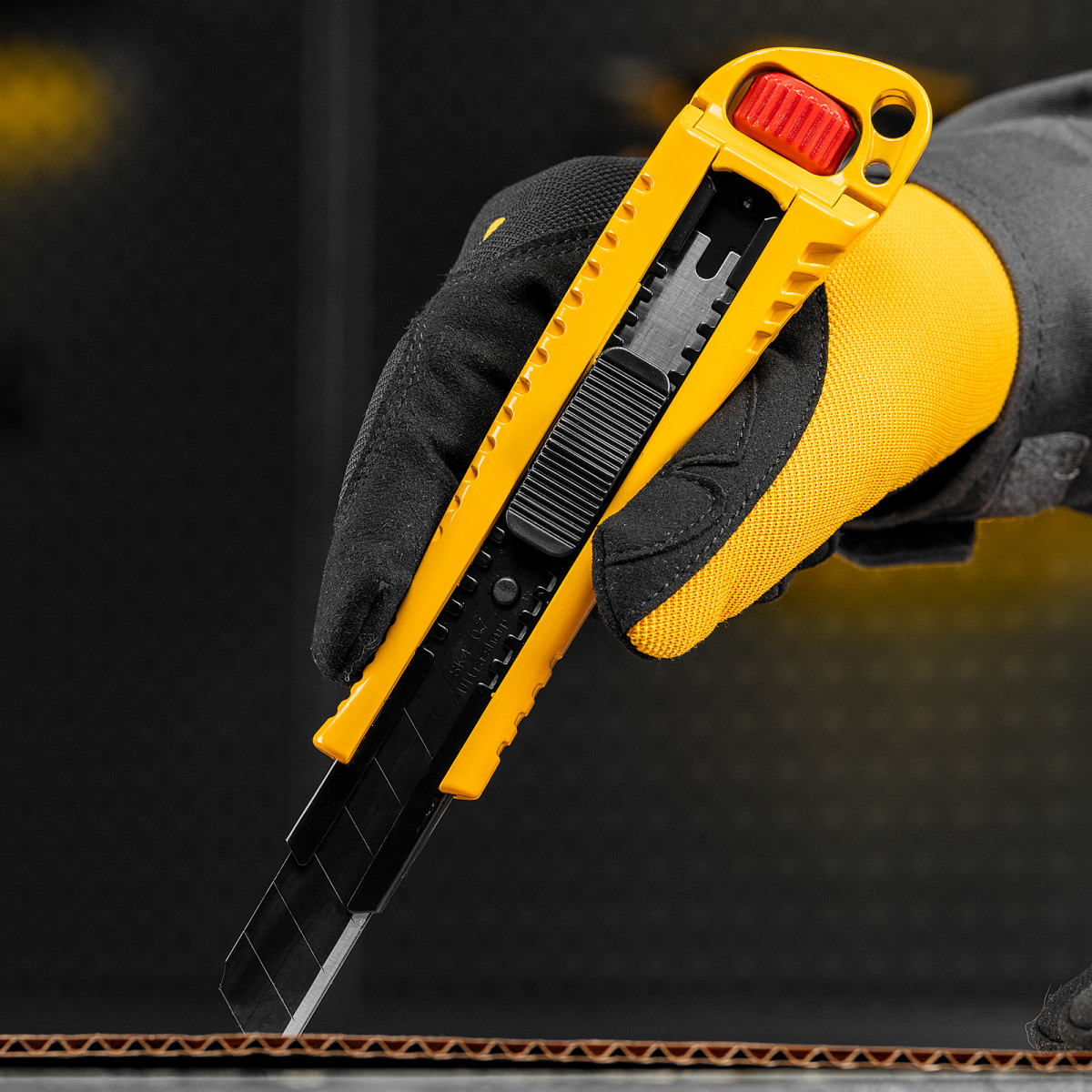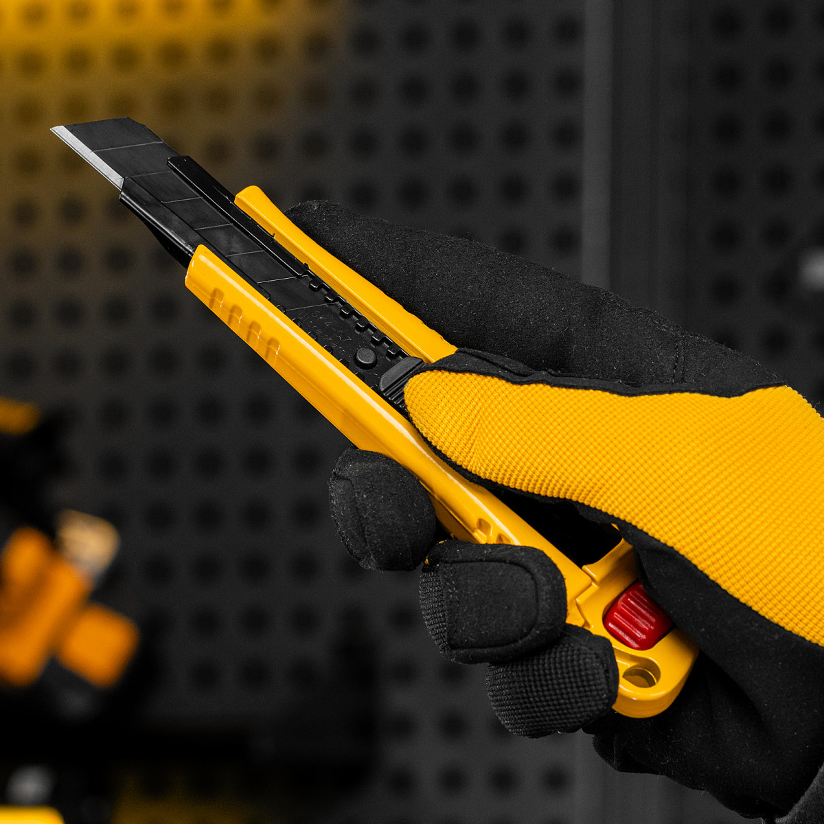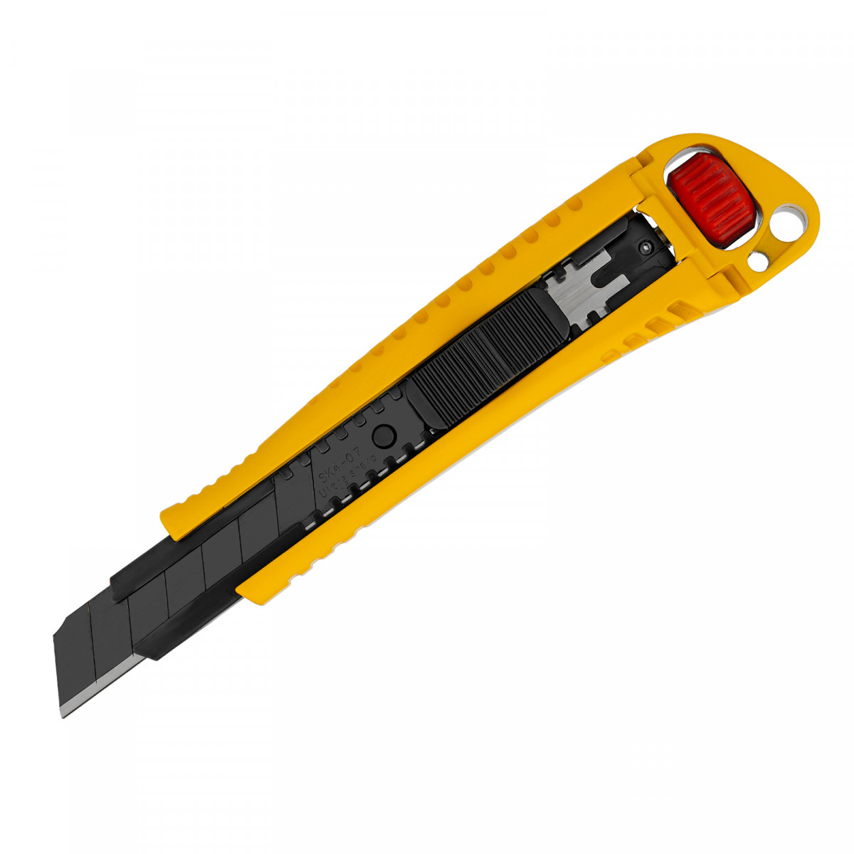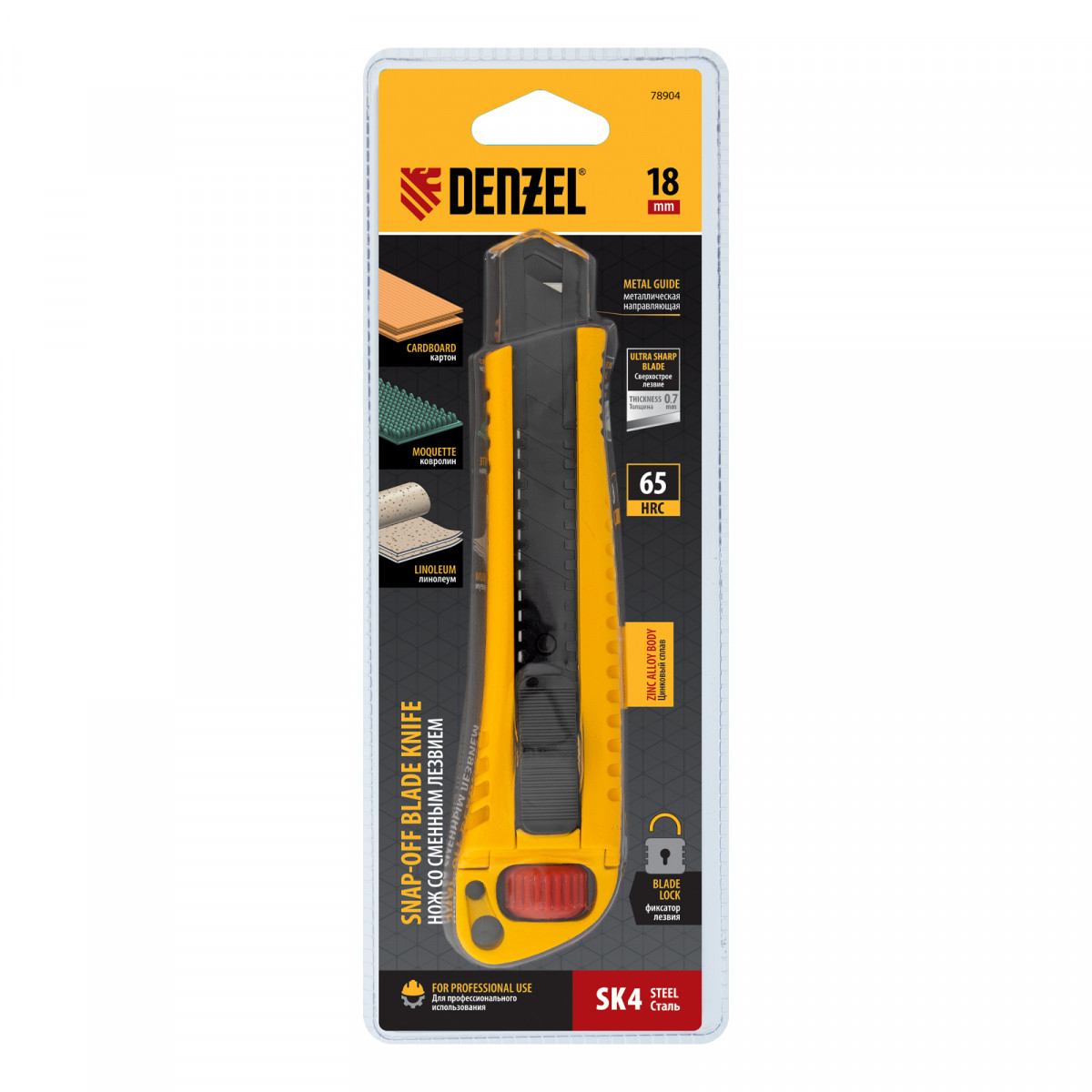 Нож, 18 мм, сменное лезвие, SK4, корпус из цинкового сплава + TPR, торцевой зажим Denzel