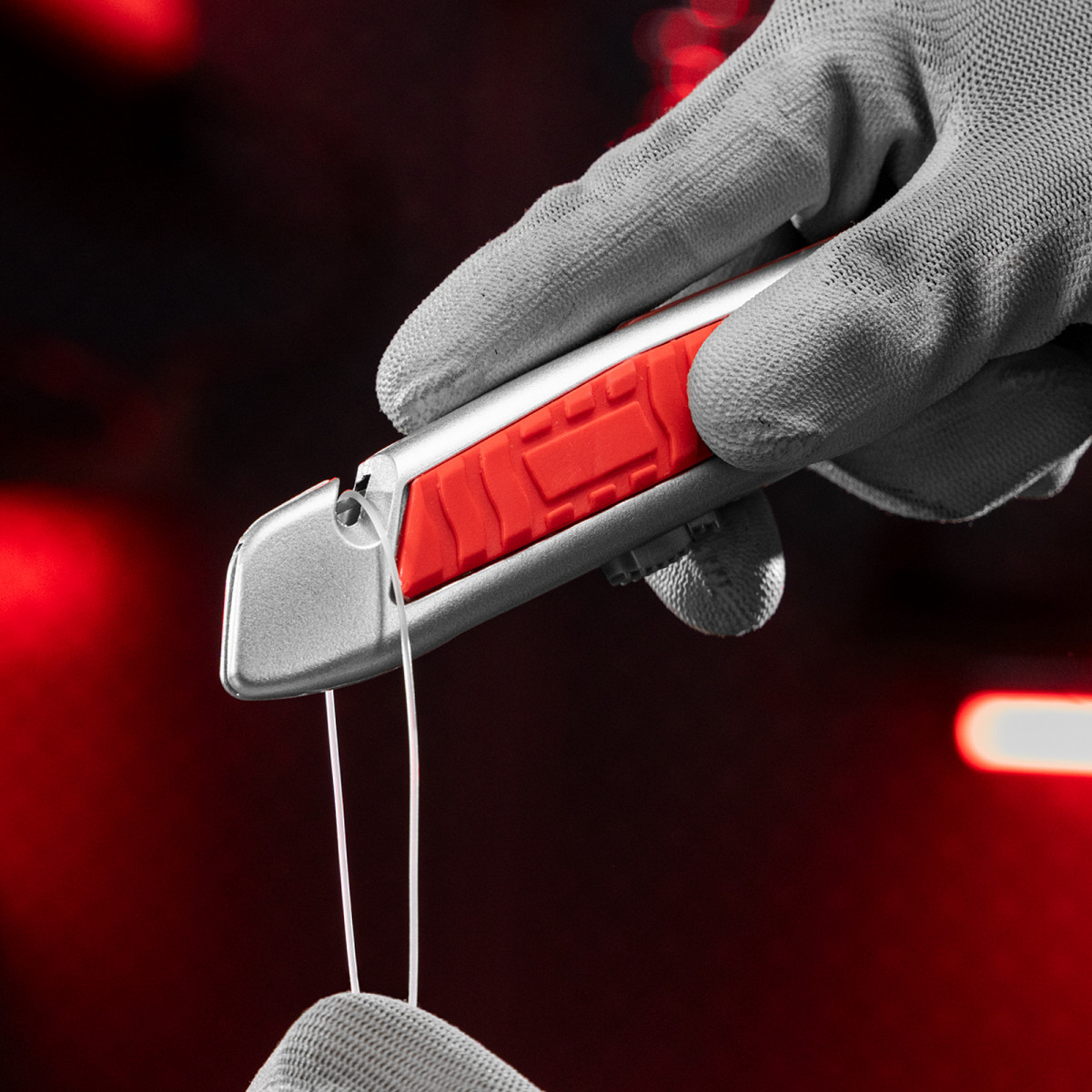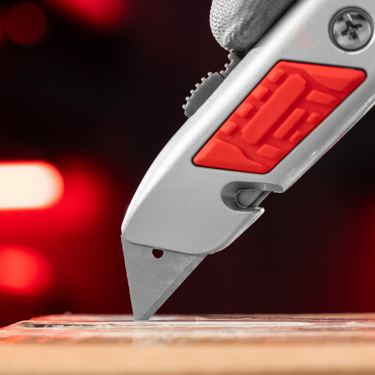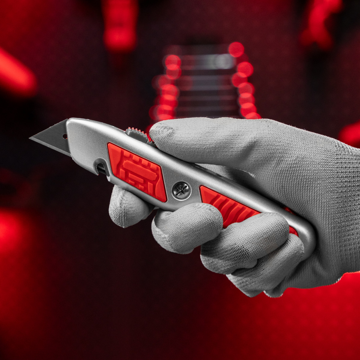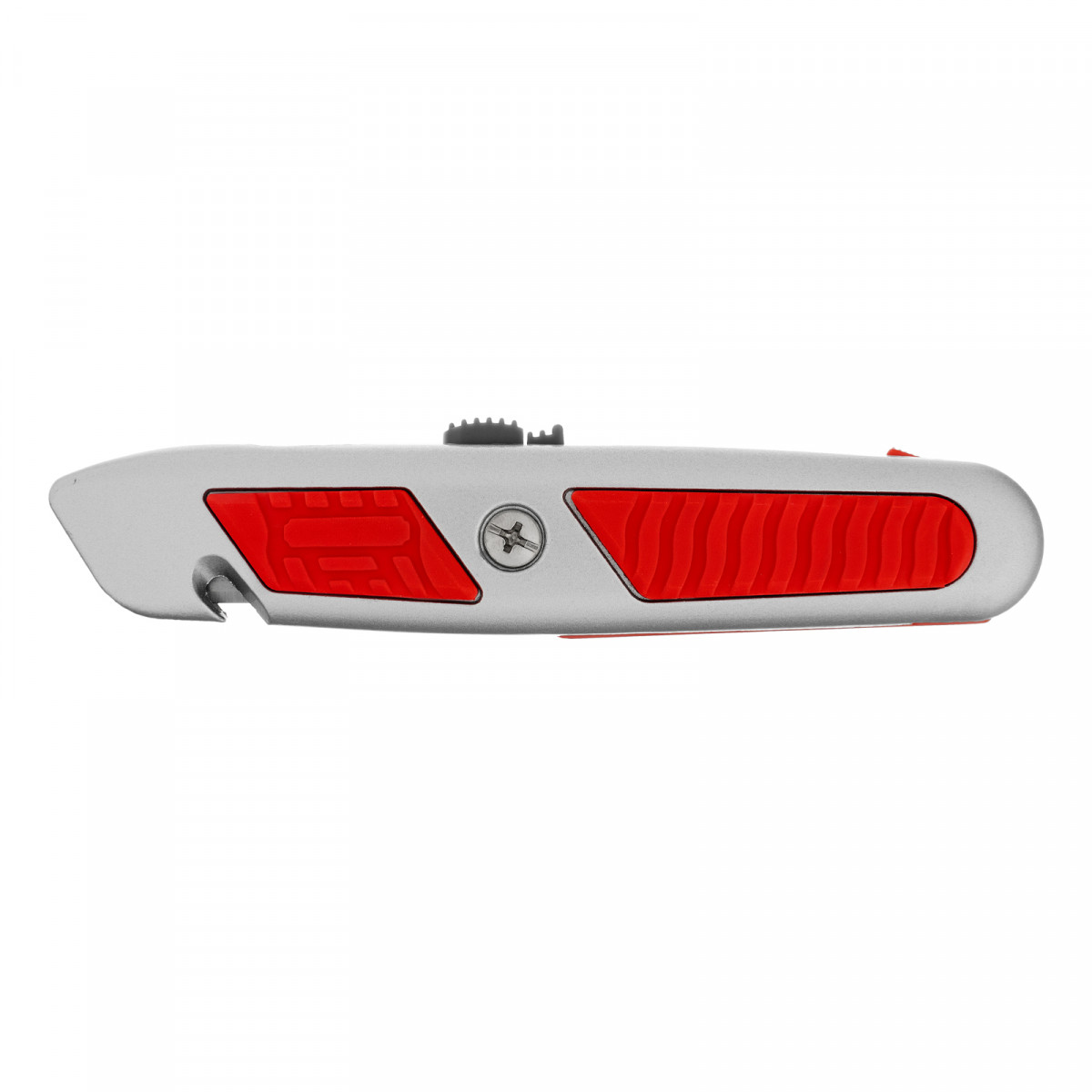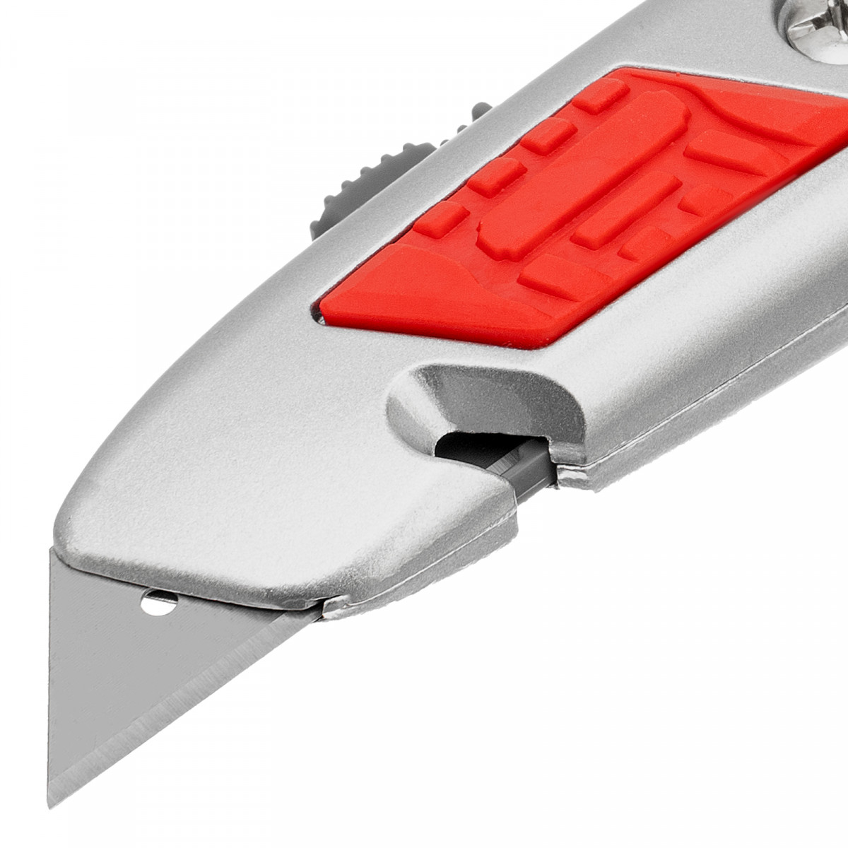 Нож Matrix 78967 с выдвижным трапециевидным лезвием и отделением для лезвий, в металлическом корпусе, режет бумагу, картон, кожу, линолеум и обои. Может применяться в качестве стропореза: для этого в корпусе предусмотрена специальная выемка. Лезвие сменное, артикул совместимых расходников 793555. Металлический корпус выдерживает значительные усилия. Нож будет полезен во время проведения строительных и отделочных работ, а также пригодится в быту.