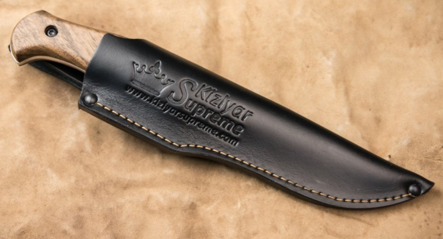 Традиционные материалы – накладки рукояти из кавказского ореха и кожаные ножны погружного типа порадуют охотников, ценящих классические природные материалы, их проверенную надежность и приятные ощущения.