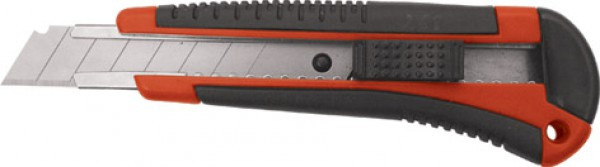 Сегментированное лезвие из инструментальной стали, автофиксация. Пластиковый корпус, с прорезиннеными вставками, усиленный металлической направляющей.