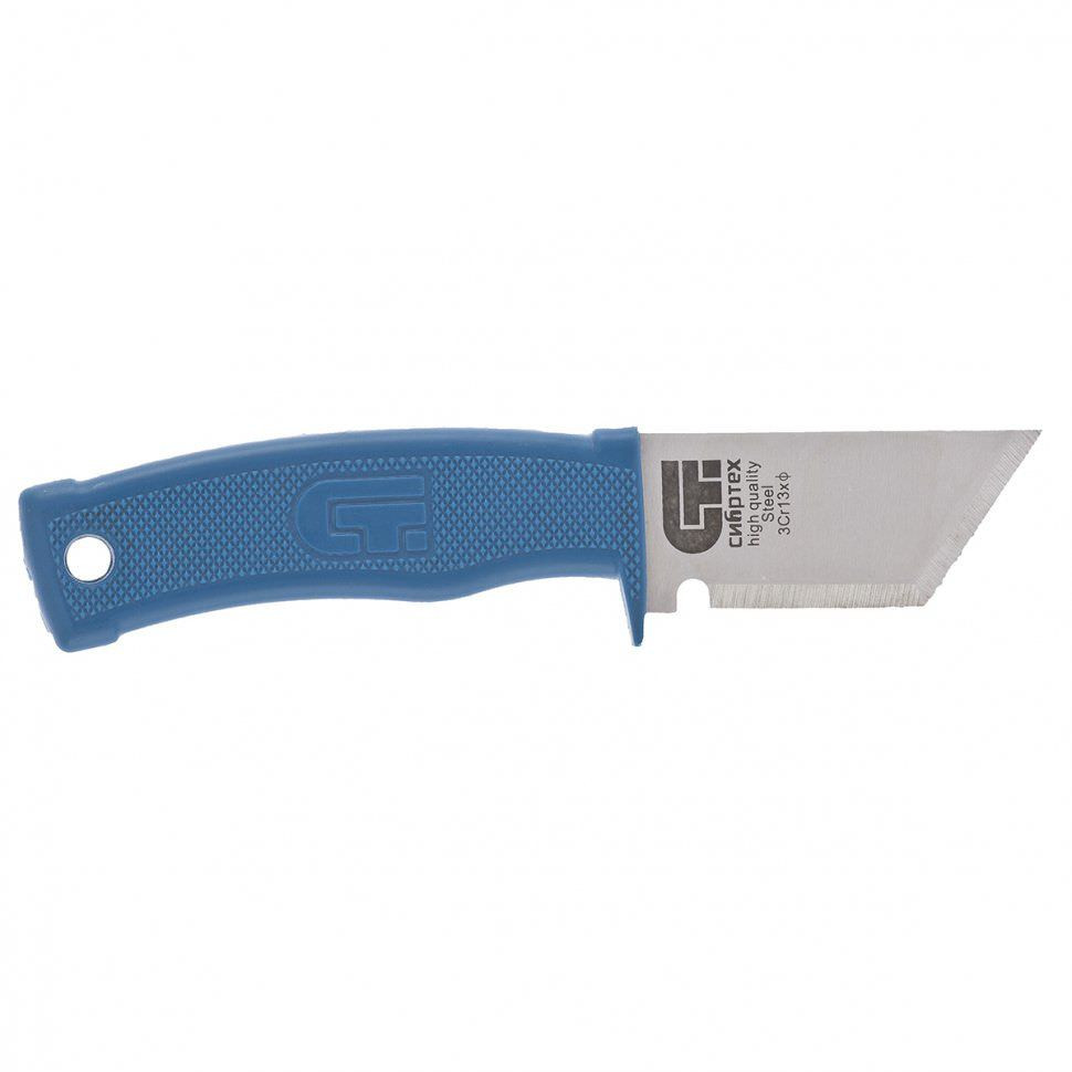 Нож СИБРТЕХ с двумя режущими кромками из стали 9ХФ обладает высокой прочностью и долговечностью.