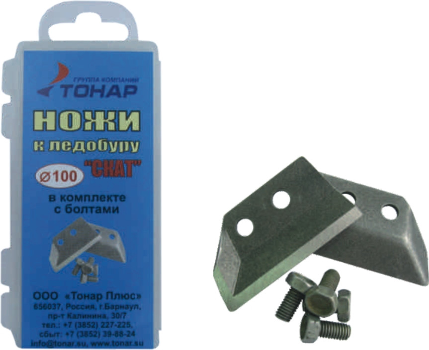 Ножи СКАТ к ледобурам с диаметром 100 изготовлены из стали марки Ст65Г. Они не откручиваются при бурении, легко перетачиваются, имеют высокую стойкость лезвия и комплектуются болтами.