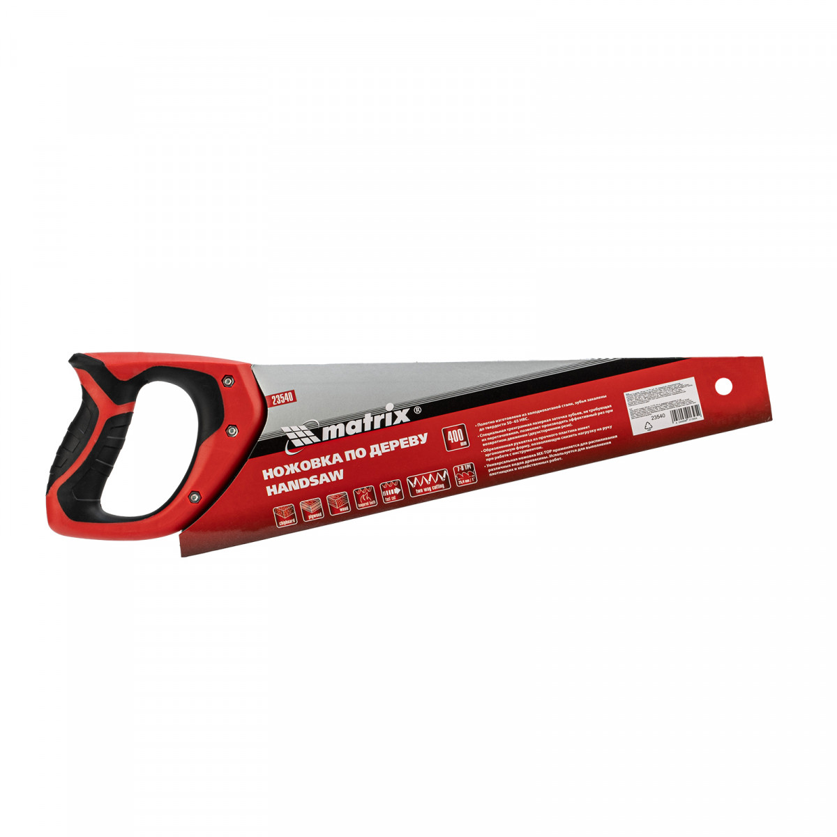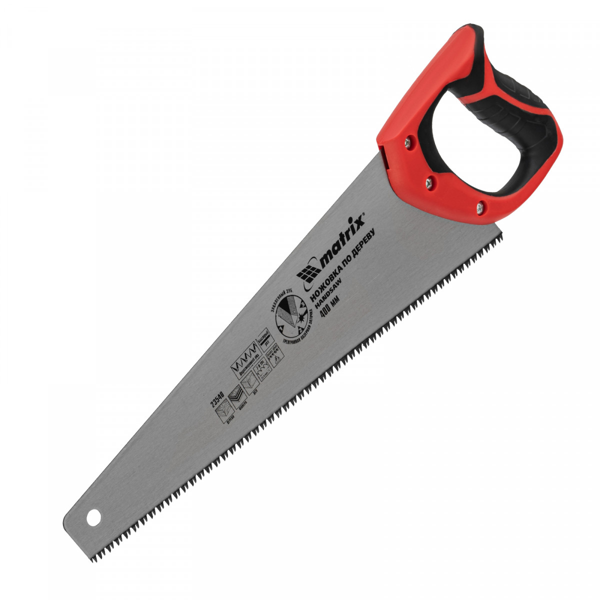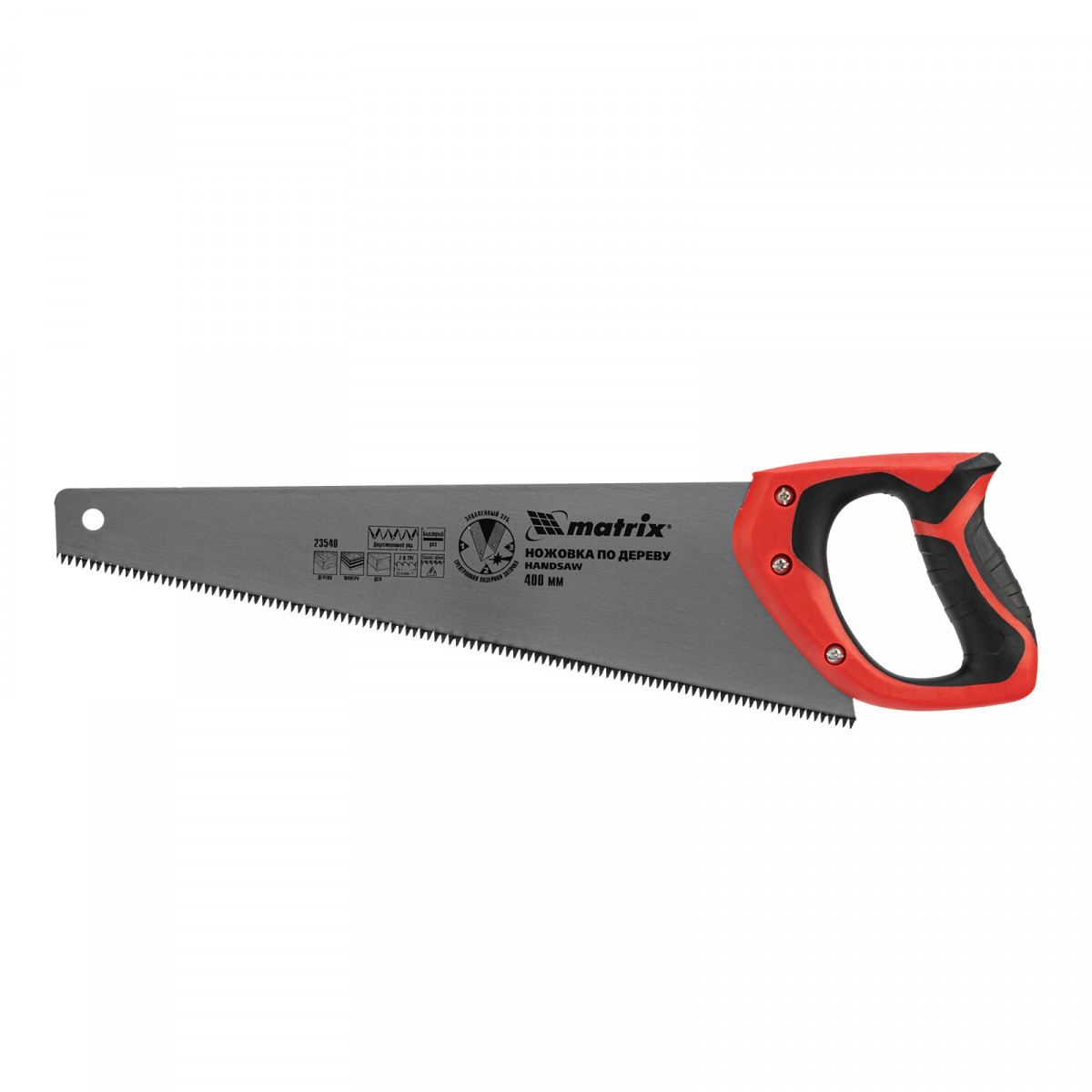 Ножовка по дереву Matrix 23540 с полотном длиной 400 мм, с калеными зубьями с 3D-заточкой и шагом 7-8 TPI, с двухкомпонентной рукояткой, используется для продольного и поперечного пиления досок, брусков, листов фанеры, ДСП. Благодаря трехгранной заточке зубьев пила характеризуется высокой производительностью. Шаг зубьев составляет 7-8 TPI, что обеспечивает быстрый и качественный рез. Ножовка пригодится в столярной мастерской, а также будет полезна в хозяйстве.