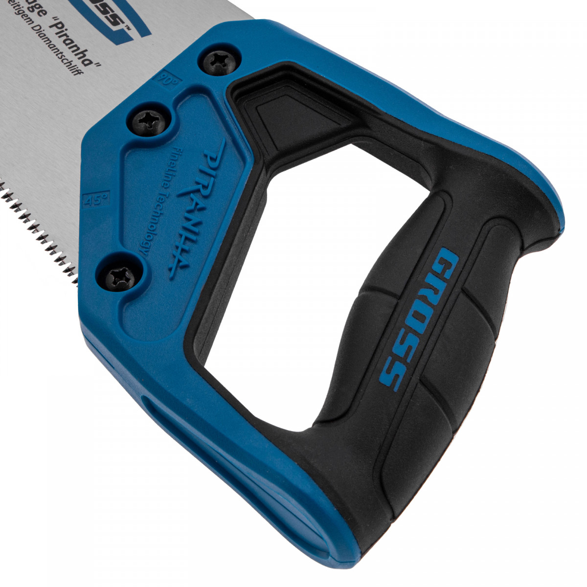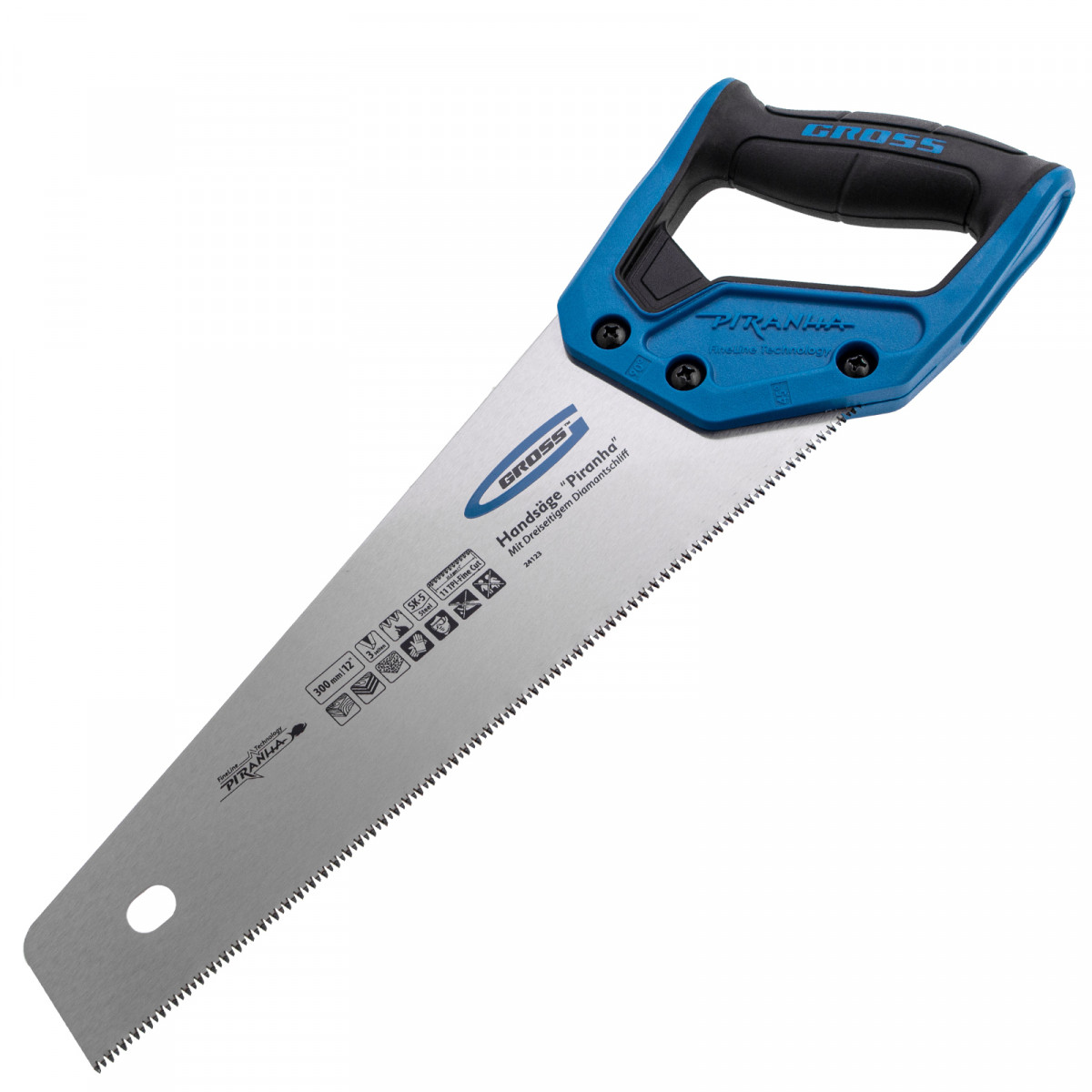 Ножовка по дереву Gross PIRANHA 24123 с полотном длиной 300 мм, калеными зубьями с 3D-заточкой и шагом 11 TPI, с 2-компонентной рукояткой, предназначена для распиловки заготовок из древесины, ДСП, ДВП, МДФ и ламината, а также из пластических материалов, таких как пенополистирол и полиуретан. Может производить продольный и поперечный распил. Мелкие зубья с шагом 11 TPI позволяют выполнять точный и чистый рез. Ножовка обладает высокой производительностью благодаря трехгранной заточке зубьев. Инструмент используется в столярном деле.