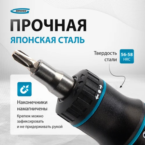 Отвертка реверсивная с револьверным механизмом GROSS 11 шт