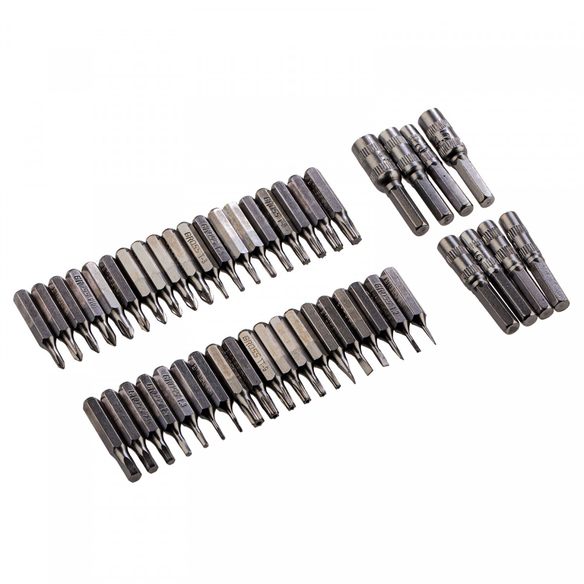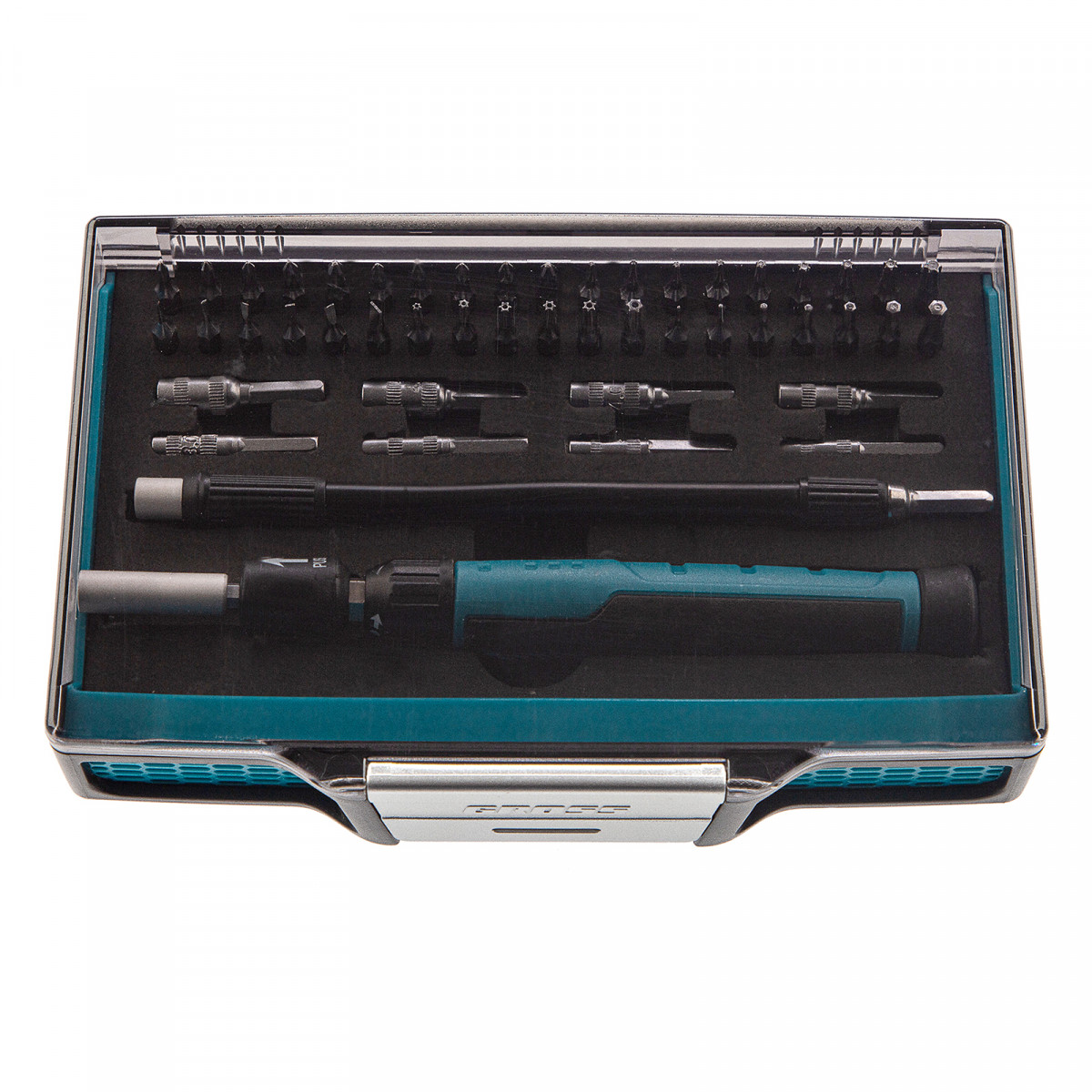 Пластиковый кейс - 1 штБиты для точных работ PH: 000, 00, 00, 0, 1 - 5 штБиты для точных работ PZ: 000, 00, 00, 0, 1 - 5 штБиты для точных работ SL: 0.8, 1.2, 1.5, 1.8, 2.0, 3.0 - 5 штБиты для точных работ Hex: 0.7, 0.9, 1.3, 1.5, 2.0, 2.5, 3.0 - 7 штБиты для точных работ Torx: T3, T4, T5, T6, T7, T8, T9, T10, TT6, TT7, TT8, TT9, TT10, TT15 - 14 штТорцевые головки: 2.5, 2.5, 3.0, 3.0, 3.5, 4.0, 4.5, 5.0 мм - 8 штТелескопическая реверсивная отвертка для точных работ - 1 штГибкий удлинитель 4 мм x 150 мм - 1 шт
