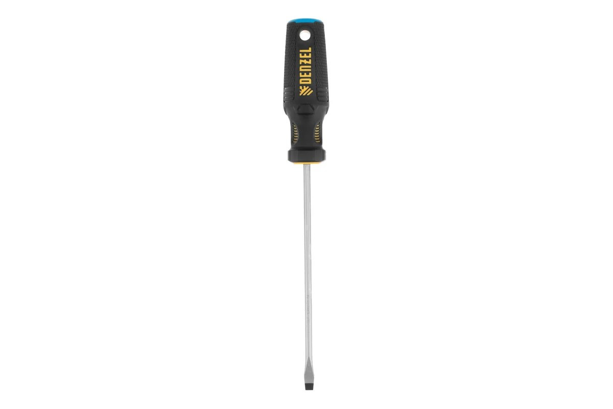 Отвертка используется для монтажа и демонтажа винтов и саморезов с прямым шлицем Slotted. Намагниченный шлиц крепко фиксируется в головке крепежа. Отвертка выдерживает интенсивное применение и предназначена для выполнения профессиональных ремонтных и монтажных работ. Эргономичная 3-компонентная рукоятка с резиновыми вставками и подпальцевыми выемками не выскальзывает из ладони и позволяет долго работать без усталости.Преимущества отвертки Denzel Стержень изготовлен из хромованадиевой стали и закален до твердости 51-55 HRC прочностьШлиц фосфатирован, а на стержень нанесено никелевое покрытие - износостойкость и защита от коррозииЦветное кольцо на затыльнике соответствует типоразмеру отвертки, что облегчает поиск нужного инструментаОтверстие в рукоятке позволяет подвешивать отвертку на крючок или скобу - удобное хранение