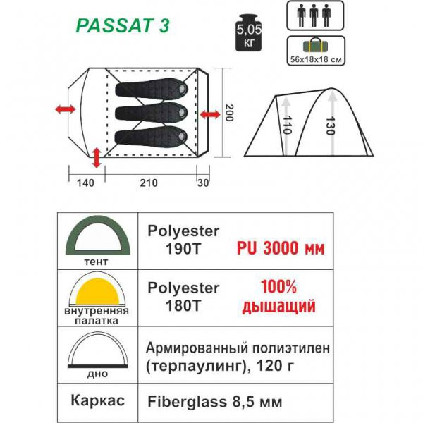 Просторная четырехместная палатка Helios PASSAT-3 – это отличный вариант для путешествий в любое время года. Helios PASSAT-3 – палатка универсальной серии,разработанная для любителей охоты, рыбалки, пеших и велосипедных прогулок. Каркас данной модели, изготовленный из прочного стекловолокна диаметром 8,5 мм, выдержит сильные нагрузки ветра и резкие перепады температуры. Так же надежной защитой от дождя и ветра будут материал тента, выполненный из полиэстера 190T, с водоотталкивающей пропиткой 2000 PU, ветровые юбки (внешняя и внутренняя) и проклеенные швы по всему периметру палатки. К преимуществам модели Helios PASSAT-3 можно отнести её компактную,легкую и быстро разборную конструкцию, включающую в себя просторный тамбур, большое спальное отделение и 3 выхода из палатки на разные стороны.