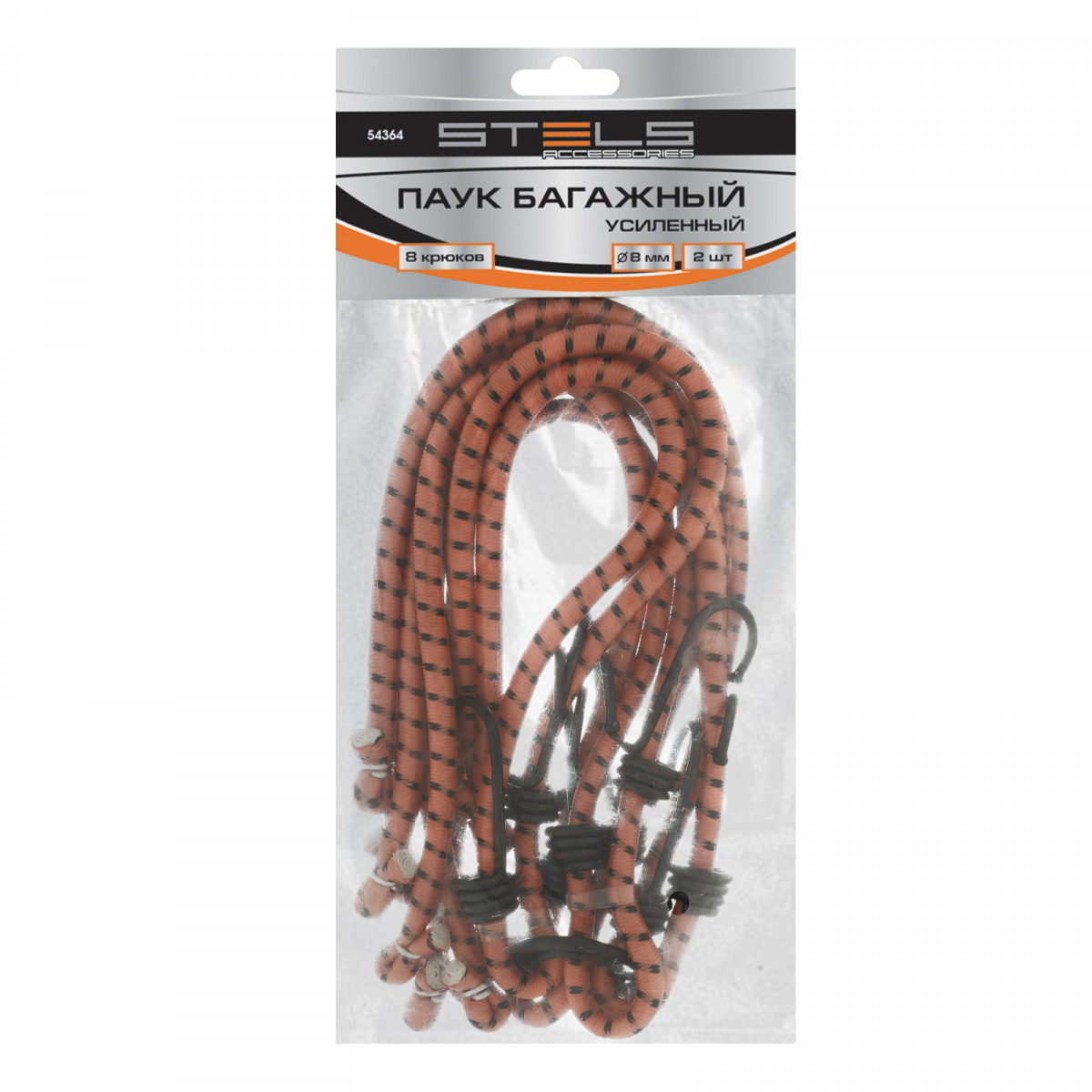 Усиленный багажный паук Stels 54364 с 8 крюками позволяет закрепить груз на решетке открытого багажника, устанавливаемого на крышу легкового автомобиля. 4 шнура длиной 80 см, схваченные кольцом посередине, надежно фиксируют предметы любой формы. Жгуты отличаются особой прочностью и эластичностью, поскольку на 50% состоят из латекса и на 50% — из резины. Изделие будет полезно при транспортировке грузов на дачу или во время путешествия.