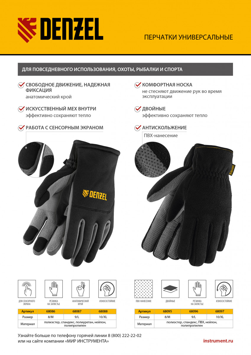 Универсальные перчатки Denzel 68095 размера 8, c ПВХ-нанесением, предназначены для повседневного использования. Также пригодятся во время охоты, рыбалки и занятий спортом.