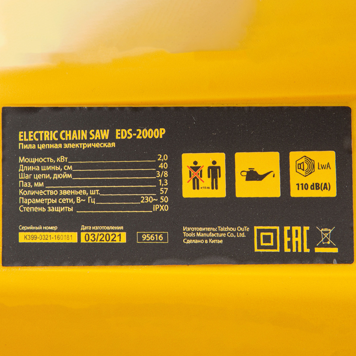 Цепная электропила Denzel EDS-2000P предназначена для заготовки дров, распиливания готовых материалов, подравнивания ветвей в саду, ремонта и частного строительства. Электромотор мощностью 2 кВт и 40-сантиметровая шина с остро заточенной цепью обеспечивают эффективное решение поставленных задач.,Пила работает от электросети и не производит вредных выбросов в окружающую среду, поэтому может эксплуатироваться в закрытых помещениях, например, в частных мастерских. Процесс запуска максимально упрощен — не нужно готовить топливную смесь, достаточно подключить пилу к электросети и она будет готова к работе.