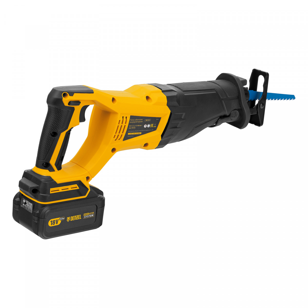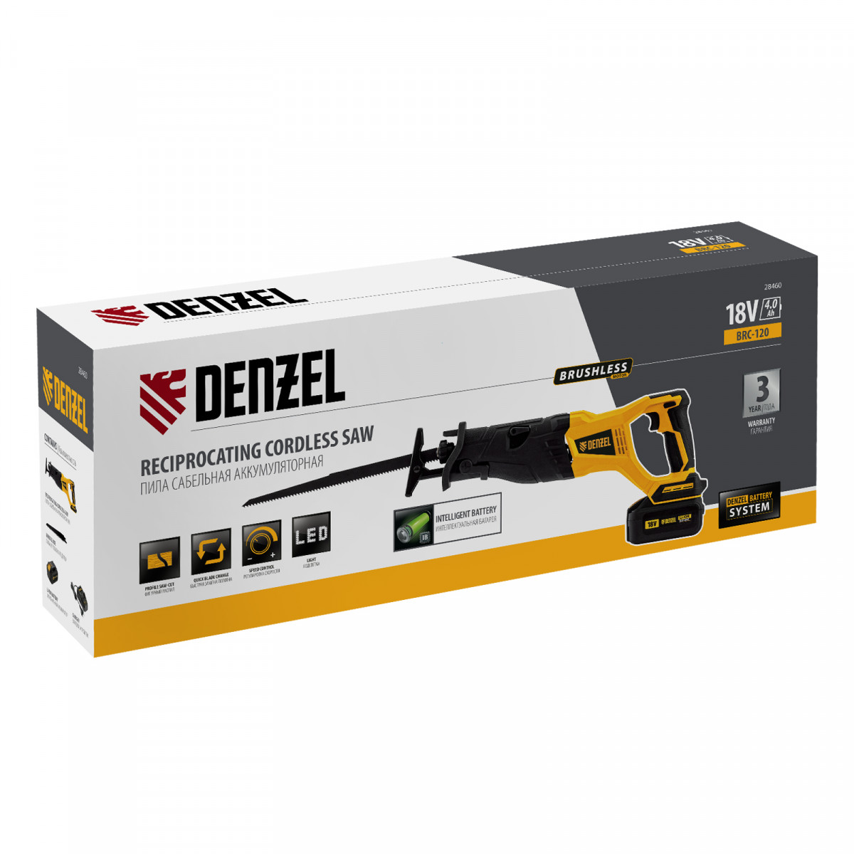 Сабельная аккумуляторная пила Denzel BRC-120 28460 с бесщеточным двигателем работает от аккумулятора Li-Ion с рабочим напряжением 18 В. Предназначена для распила фанеры, досок, ДСП, ДВП, пластика, а также для обрезки веток. Максимальная глубина пропила в древесине составляет 120 мм, в стали — 10 мм. Оснастка совершает до 3100 ходов в минуту, что обеспечивает эффективную работу.,Универсальный аккумулятор емкостью 4 А/ч, с интеллектуальной системой распознавания нагрузки, рассчитан на длительный срок службы. Он совместим со всеми инструментами единой платформы Denzel battery system 18V серии IB.