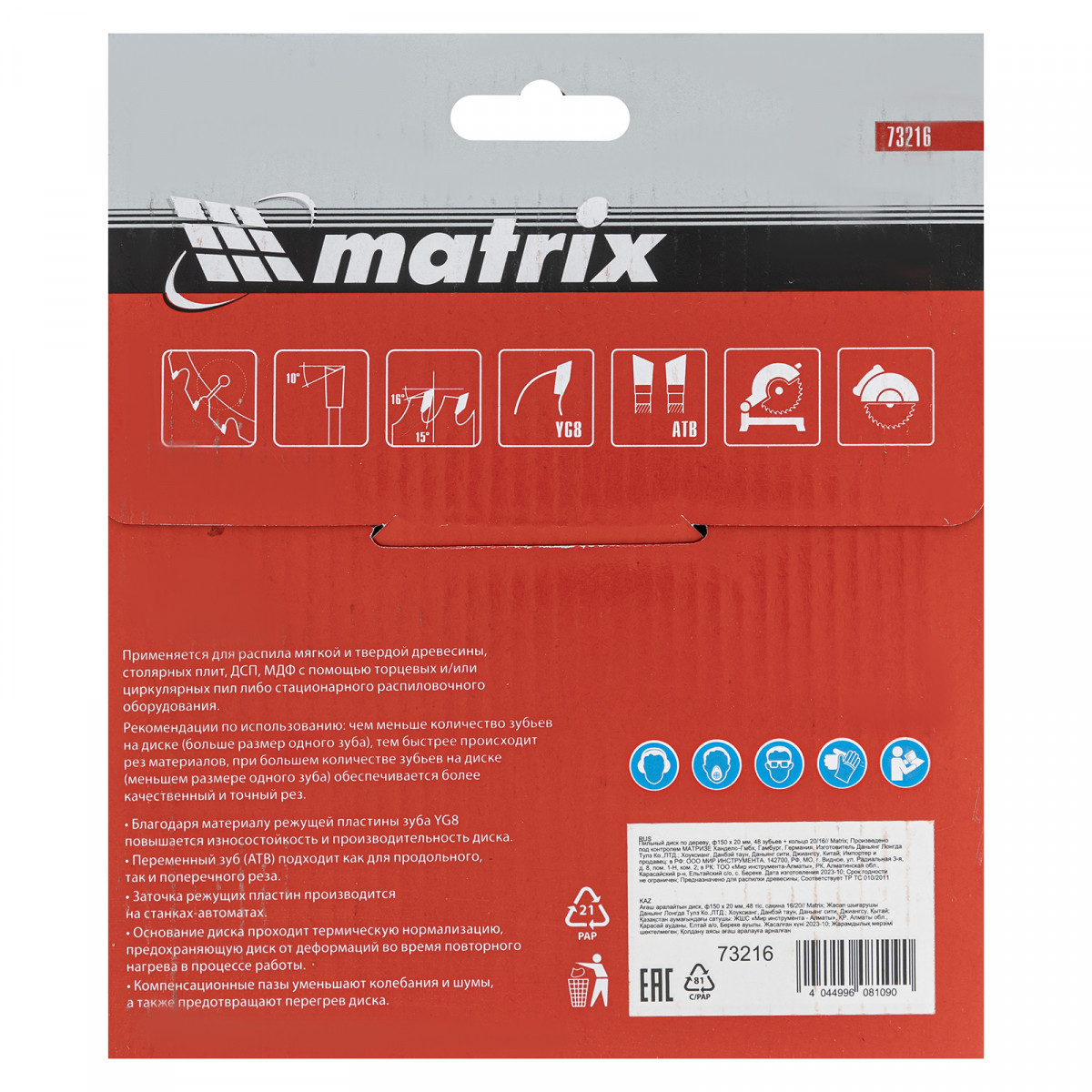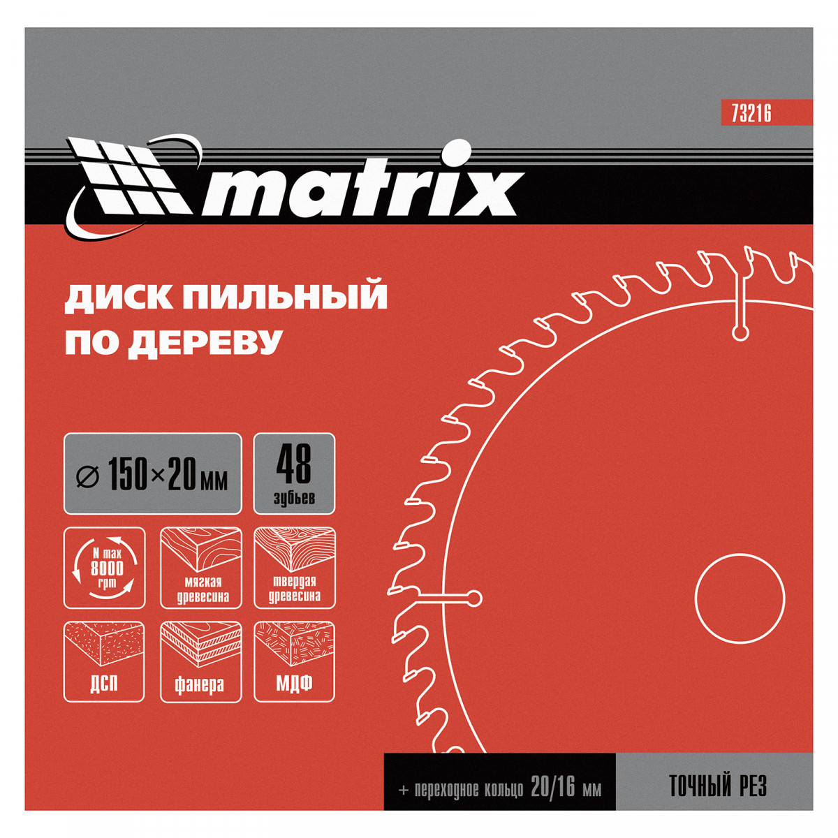 Пильный диск по дереву Matrix 73216 диаметром 150 х 20 мм, с 48 зубьями и переходным кольцом 20/16, — оснастка для циркулярных и торцовочных пил с соответствующим посадочным и внешним диаметром. Используется преимущественно для поперечного реза материалов из мягкой и твердой древесины, ДСП, ДВП, фанеры, столярных плит. В комплект поставки входит переходное кольцо 20/16, позволяющее самостоятельно изменить посадочный диаметр при необходимости. Диск подходит для бытового и профессионального применения.