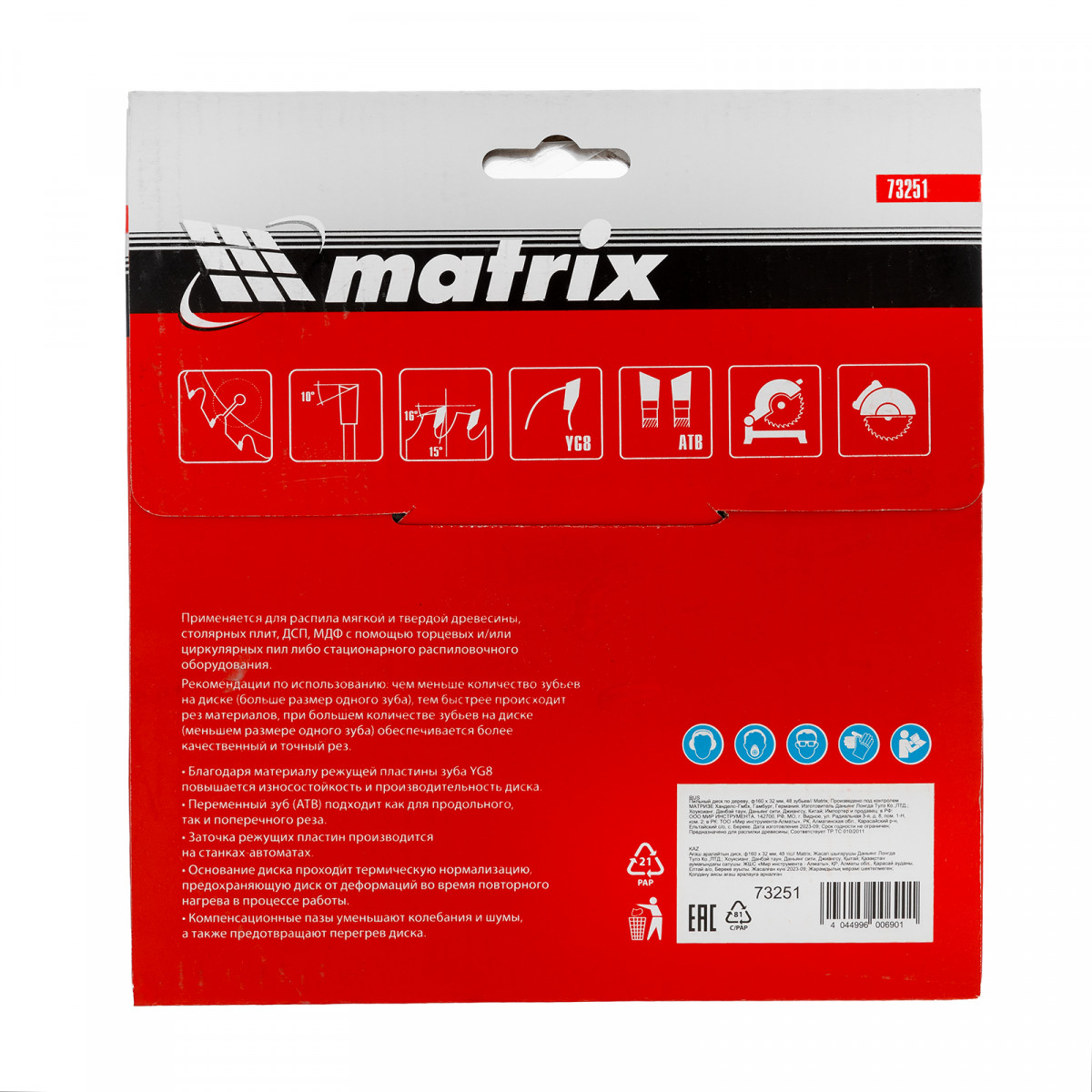 Пильный диск по дереву Matrix 73251 диаметром 160 х 32 мм, с 48 зубьями, — оснастка для циркулярных и торцовочных пил с соответствующим посадочным и внешним диаметром. Используется преимущественно для поперечного реза материалов из мягкой и твердой древесины, ДСП, ДВП, фанеры, столярных плит. Диск подходит для бытового и профессионального применения.