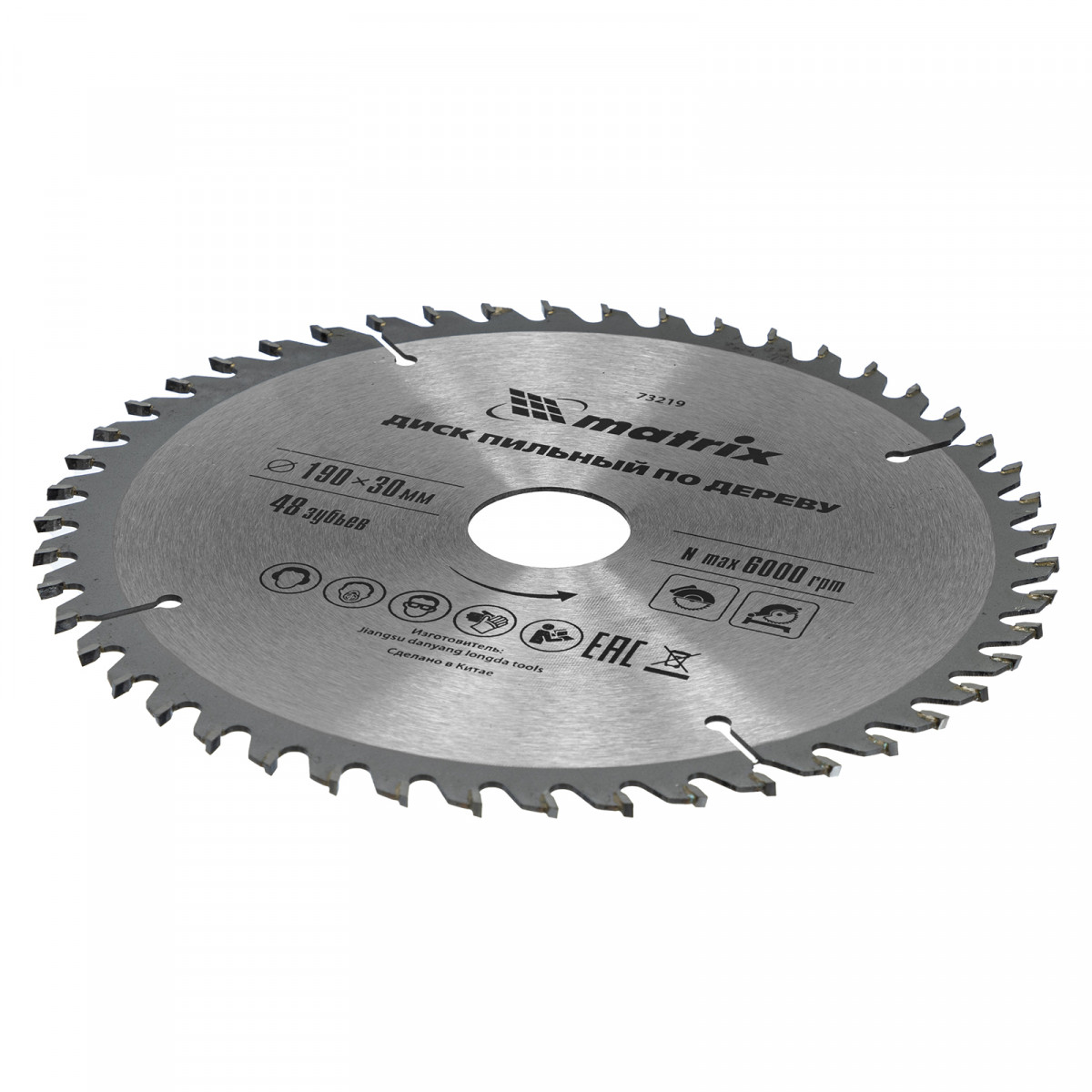 Пильный диск по дереву Matrix 73219 диаметром 190 х 30 мм, с 48 зубьями, — оснастка для циркулярных и торцовочных пил с соответствующим посадочным и внешним диаметром. Используется преимущественно для поперечного реза материалов из мягкой и твердой древесины, ДСП, ДВП, фанеры, столярных плит. Диск подходит для бытового и профессионального применения.