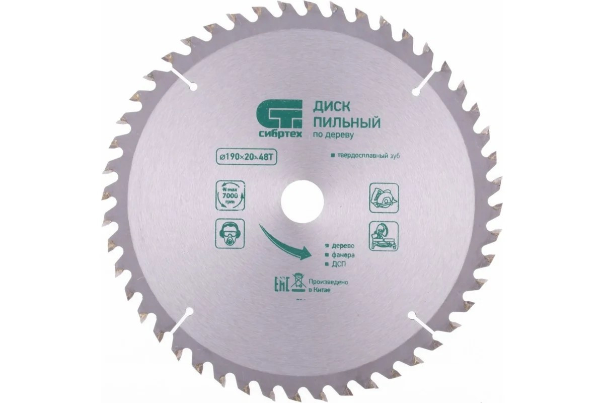 Пильный диск по дереву Сибртех 732147, ф190 х 20 мм, с 48 зубьями и переходным кольцом 20/16 предназначен для распила древесины мягких и твердых пород, фанеры, ДСП, МДФ.