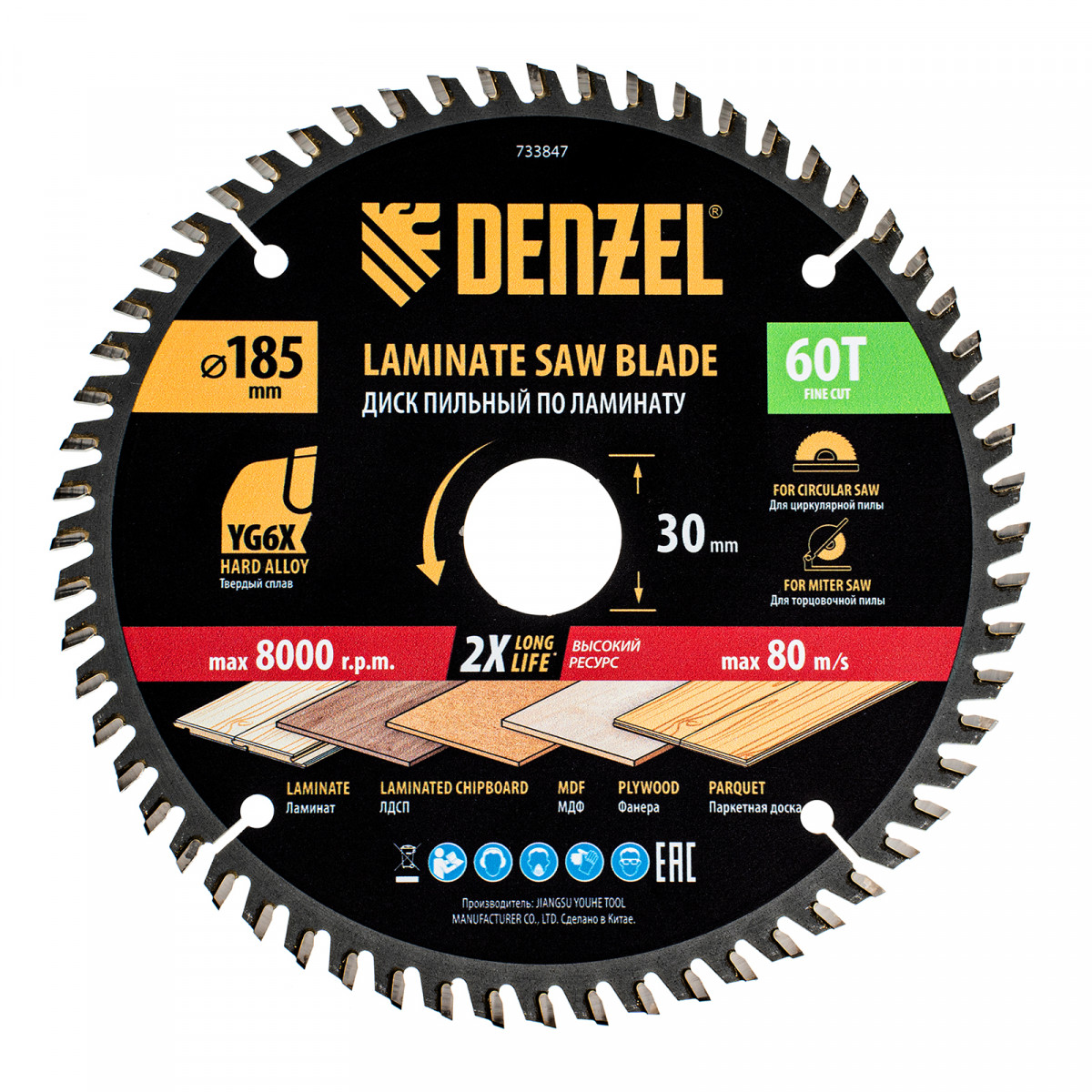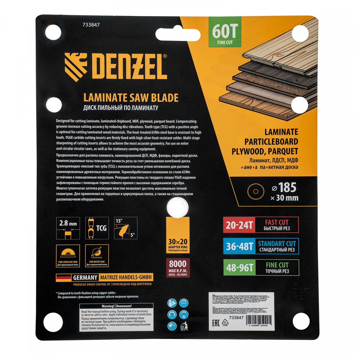 Пильный диск Denzel 733847 диаметром 185 x 30 мм, с 60 зубьями, используется для точного распиливания ламината, ЛДСП, МДФ, фанеры, паркетной доски. 60 мелких трапециевидно-плоских зубьев с положительным углом заточки позволяют эффективно решать поставленные задачи, обеспечивая чистый рез. Диск устанавливается на циркулярную или торцовочную пилу, а также на распиловочный станок. Можно установить оснастку на инструмент с другим посадочным диаметром — для этого предусмотрено переходное кольцо 30/20 мм.