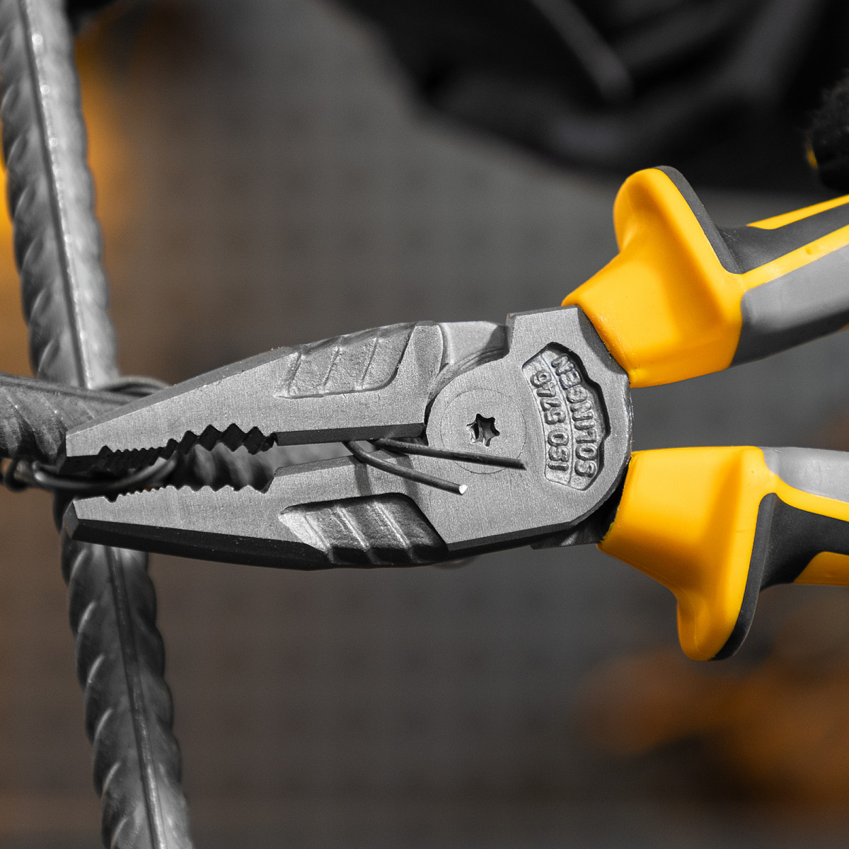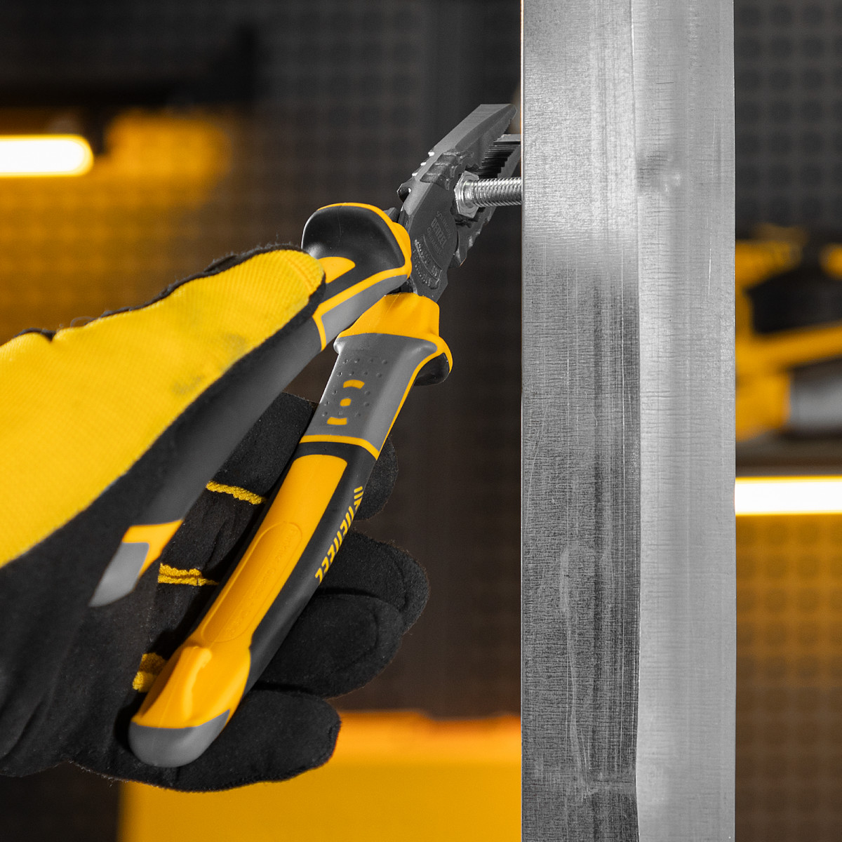 Комбинированные плоскогубцы Denzel 17082 длиной 205 мм, с трехкомпонентными рукоятками, используются для зажима и удержания деталей, сгибания металлических листов. Позволяют также перекусывать мягкую проволоку (алюминиевую, медную, с пределом прочности 220 Н/мм2) диаметром до 5,9 мм, проволоку средней жесткости и гвозди (750 Н/мм2) диаметром до 3,8 мм, а также жесткую (1800 Н/мм2) толщиной до 2,5 мм. Имеют внутренние грани специальной формы, предназначенные для использования инструмента в качестве гаечного ключа. Губки с насечками надежно удерживают заготовки. Плоскогубцы пригодятся профессионалу и частному мастеру при проведении слесарных, ремонтных и сборочных работ.