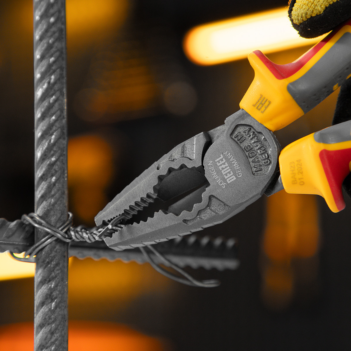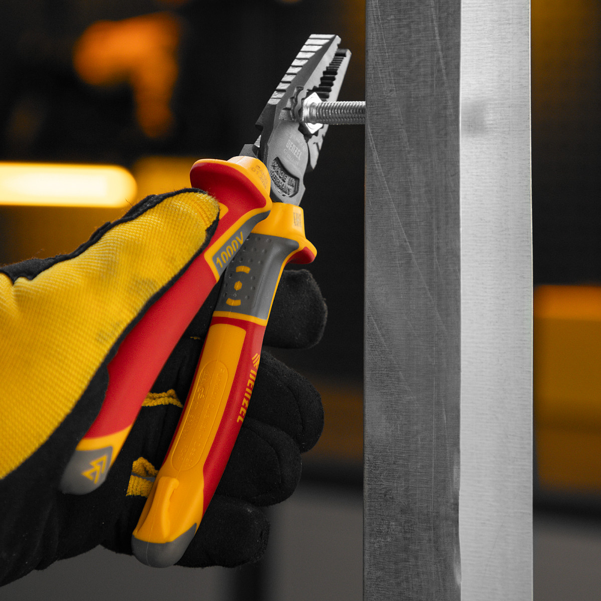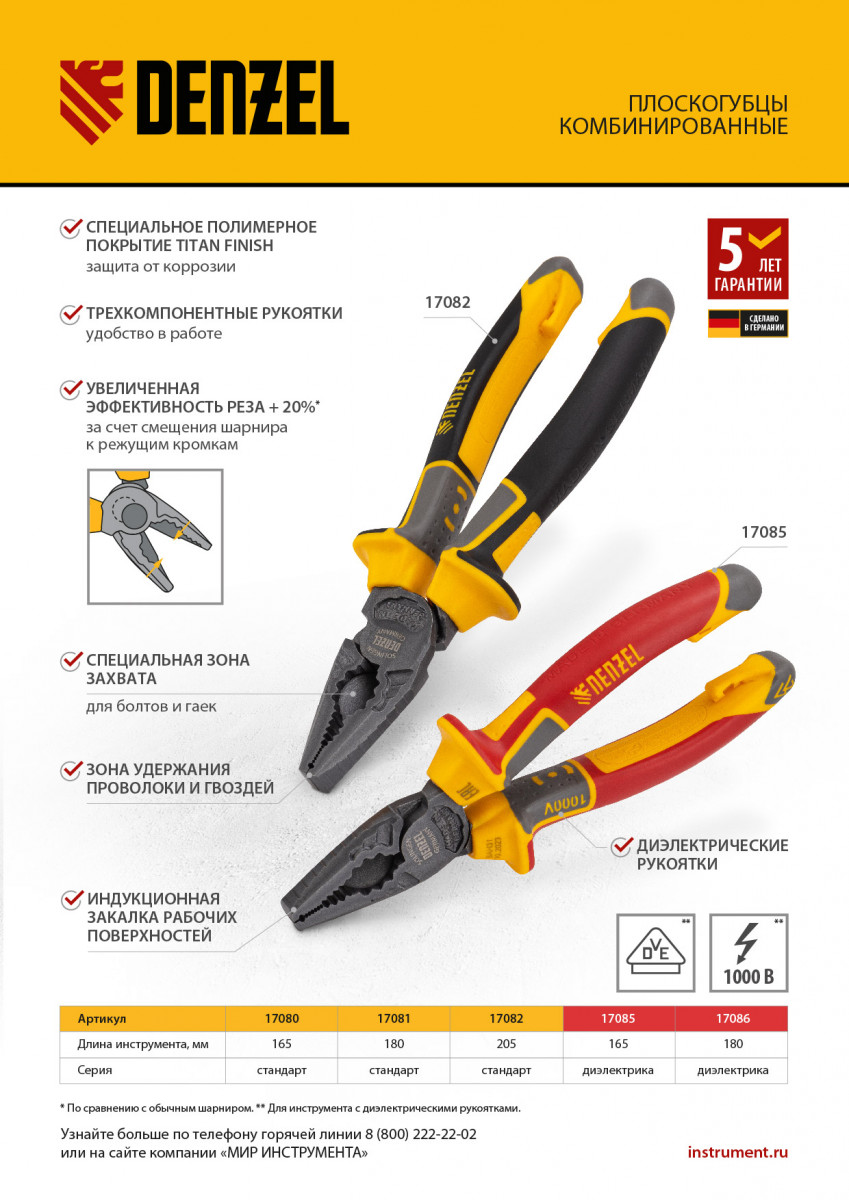 Комбинированные плоскогубцы Denzel 17086 длиной 180 мм, с диэлектрическими трехкомпонентными рукоятками, выдерживающими до 1000 В, предназначены для выполнения работ с токопроводящими элементами. С их помощью можно захватить или согнуть мелкие и крупные детали, перекусить проволоку или перерезать провод. Инструмент подходит для работы с мягкой проволокой (алюминиевой, медной, с пределом прочности 220 Н/мм2) диаметром до 5,2 мм, проволокой средней жесткости и гвоздями (750 Н/мм2) диаметром до 3,4 мм, и жесткой (предел прочности 1800 Н/мм2) толщиной до 2,2 мм. Также плоскогубцы можно использовать в качестве гаечного ключа. Инструмент незаменим для проведения слесарных и монтажных работ с различными компонентами и материалами. Внимание: перед началом работ следует отключить напряжение!