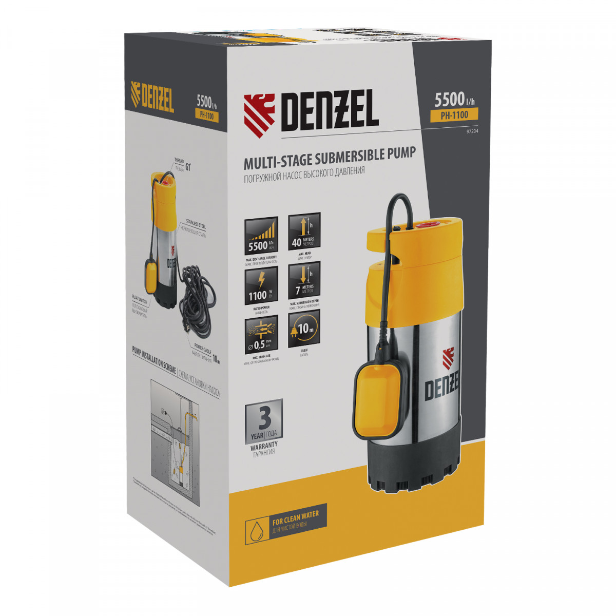 Погружной насос высокого давления PH1100, 1100Вт, подъем 40м, 5500 л/ч Denzel