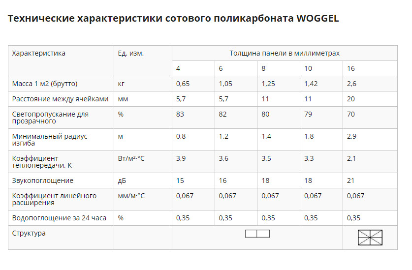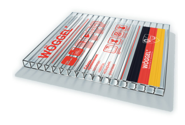 Сотовый поликарбонат Woggel — высококачественный материал, разработанный КИН совместно с европейскими специалистами. имеют UV-слой 50 мкм, благодаря чему материал сохраняет свои физико-механические характеристики; гибкость — листы WÖGGEL легко гнутся при монтаже в соответствии с формой конструкции и в соответствии с нормами изгиба; теплоизоляция — применение поликарбоната WÖGGEL в качестве стенового ограждения и покрытий сооружений сокращает расходы на отопление примерно на 30% (по сравнению со стеклом); шумопоглощение — уровень снижения шума сотовым поликарбонатом WÖGGEL различных толщин составляет от 15 до 21 Дб.
