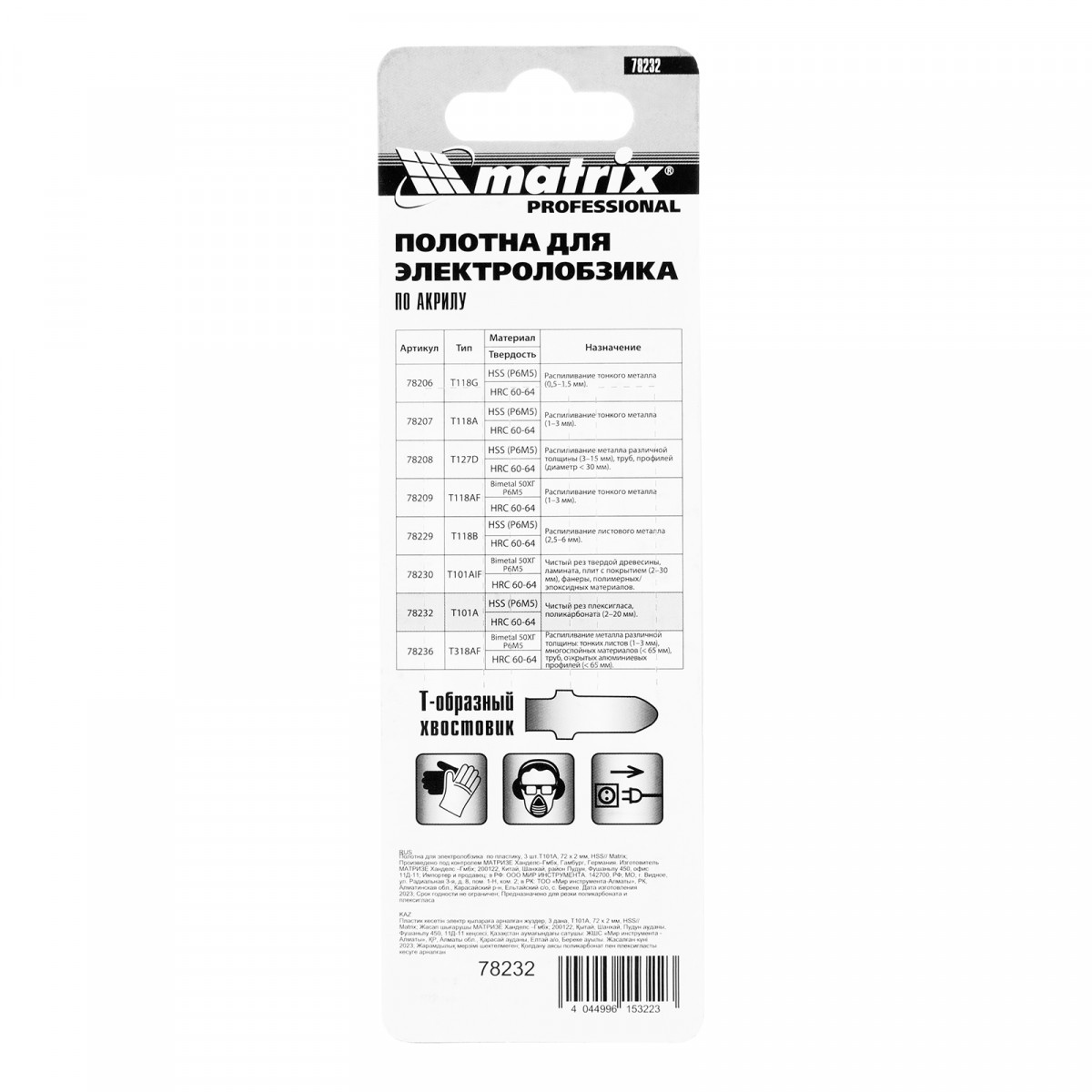 Полотна для электролобзика по пластику, 3 шт, T101A, 72 x 2 мм, HSS Matrix