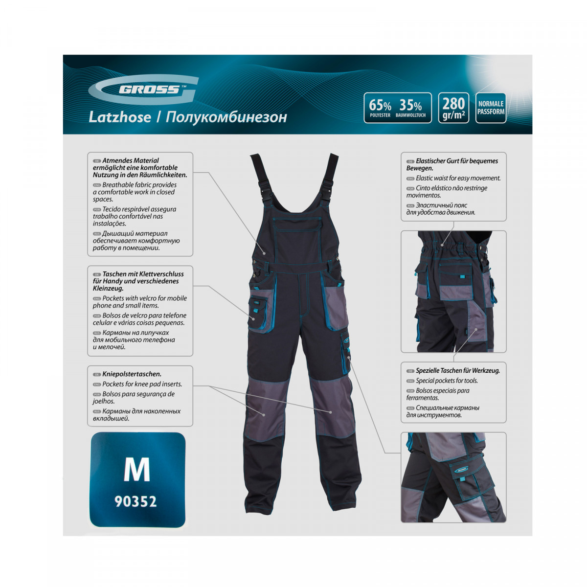 Полукомбинезон Gross 90352 размера M рассчитан на рост 173-179 см и предназначен для защиты рабочего от механических повреждений, ветра и пыли. Может применяться в отапливаемых помещениях или на улице в теплое время года. Изготовлен из смесовой ткани с 35%-м содержанием хлопка, которая не препятствует воздухообмену, поэтому в спецодежде комфортно работать. На 65% ткань состоит из полиэстера, что обеспечивает устойчивость к износу. Полукомбинезон необходим строителям, электрикам, садовникам, сотрудникам автосервисов, будет полезен и рабочим других специальностей.