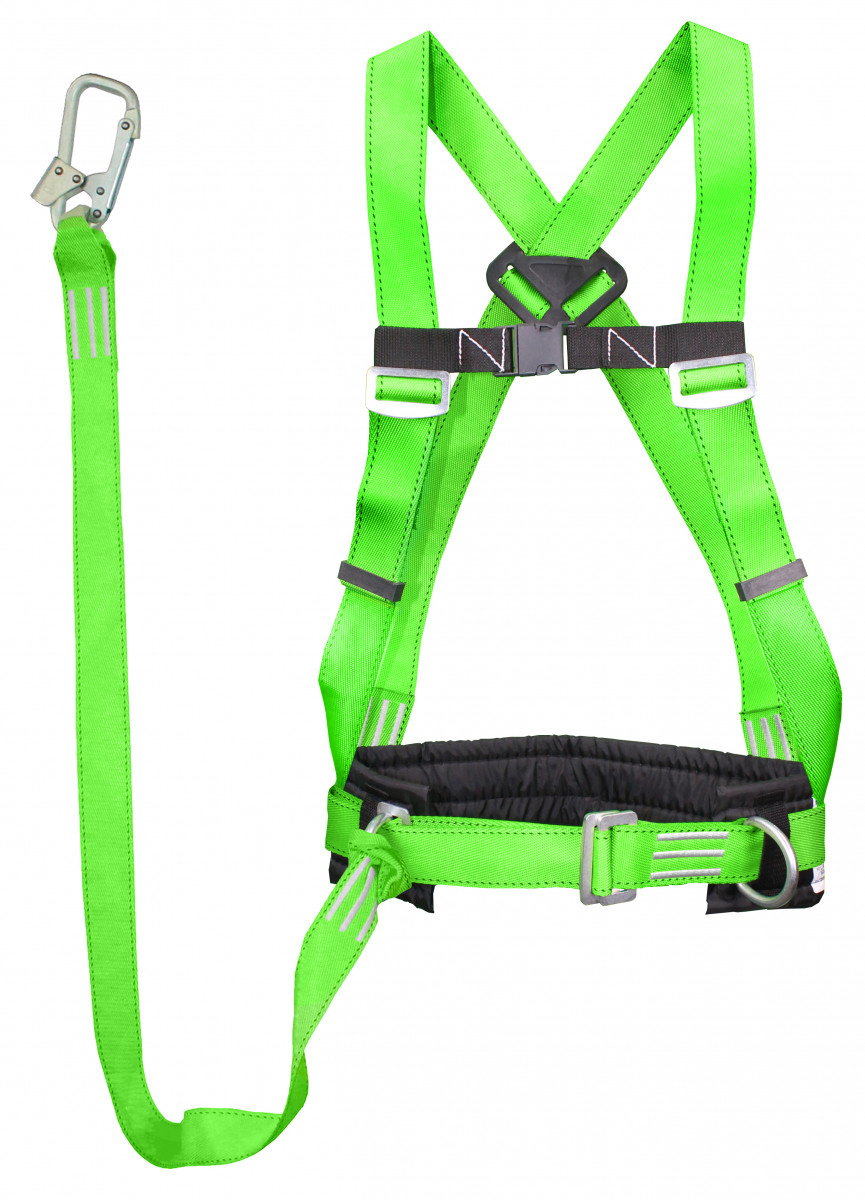 Включает в себя ремень с пряжкой (позволяет подгонять пояс по фигуре человека), подкладку под ремень (кушак), наплечные лямки, элементы крепления – два металлические D-кольца на ремне привязи и одно на спине, строп из полиамидной ленты с монтажным карабином (4 типа карабинов), бирку, выполненную в соответствии с ГОСТ Р ЕН 365, паспорт-инструкцию с отметкой ОТК и гарантией производителя (закреплен под биркой на кушаке).Величина обхвата талии, обеспечиваемая ремнем, мм: 840-1500