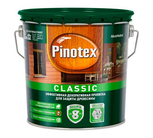 Пропитка cодержит активные добавки против плесени и синевы. Окрашенная поверхность устойчива к воздействию солнца, дождя, снега и мороза. Pinotex Classic легко наносится и быстро впитывается в поверхность древесины, образуя полуматовое покрытие. Подчеркивает естественную текстуру древесины. Для усиленной защиты глубоких слоев древесины от биокоррозии рекомендуется применять пропитку в системе с грунтовкой  Pinotex Base. Возможно применение для защиты бревенчатых строений и полукруглых облицовочных профилей.