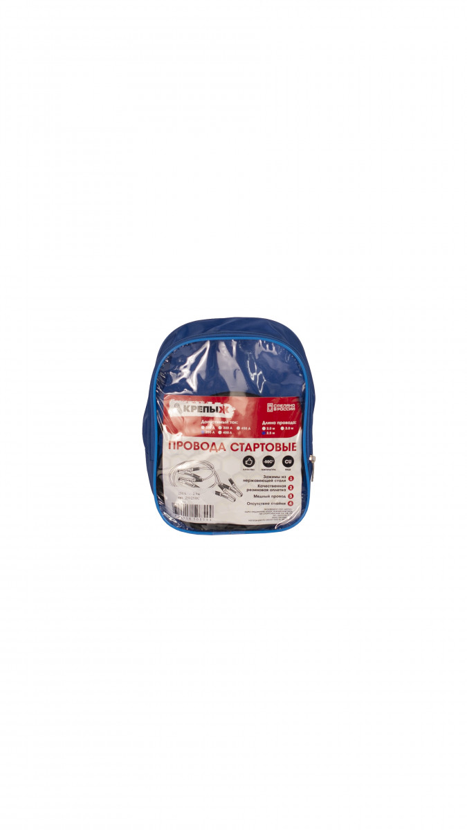Стартовые провода КРЕПЫЖ предназначены для запуска двигателей легковых и грузовых автомобилей с разряженной аккумуляторной батареей при любых погодных условиях. Благодаря высокому качеству наши провода служат дольше, чем провода других производителей. • Морозостойкий эластичный кабель в резиновой изоляции - позволяет проводу оставаться эластичным даже в самый суровый мороз. • Медный кабель провода - медь является лучшим проводником. • Концы провода луженые - что позволяет избежать окисления и сохранить проводниковые свойства. • Крокодилы изготовлены из нержавеющей стали, благодаря которой зажимы не ржавеют в отличии крокодилов из оцинкованного металла, где со временем слой цинка становится меньше и появляется коррозия. • Соединение провода с крокодилом запрессованное - исключает отсоединение и потерю контакта. • Заявленная длина провода рассчитана без длины крокодилов. Дает дополнительный запас длины и удобства в эксплуатации. • Температура эксплуатации от- 50 С до + 80 С