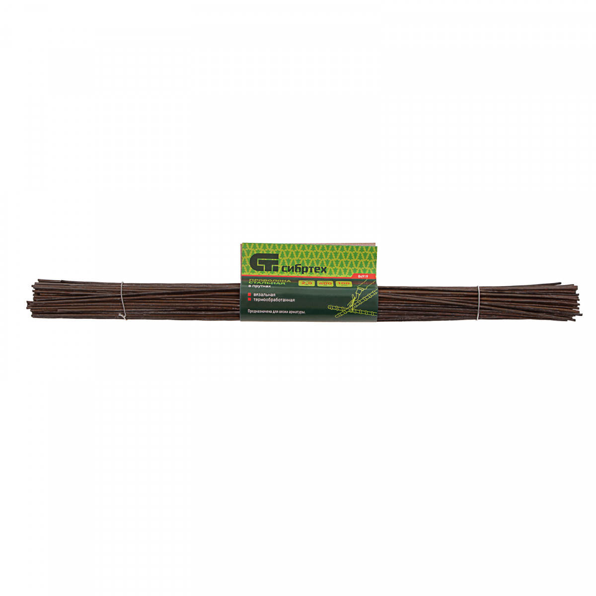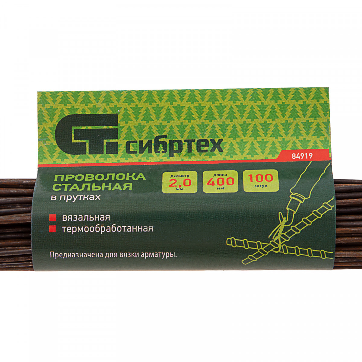Вязальная стальная проволока в прутках Сибртех 84919, термообработанная, длиной 400 мм и диаметром 2 мм, 100 шт., предназначена для вязки стальных сеток и арматуры. Пригодится на строительных площадках для армирования конструкций из железобетона.